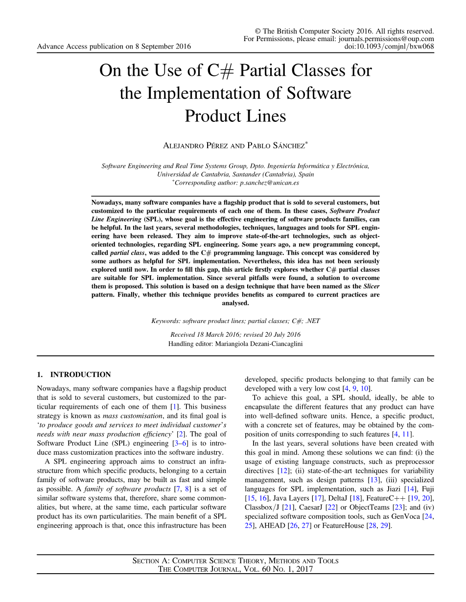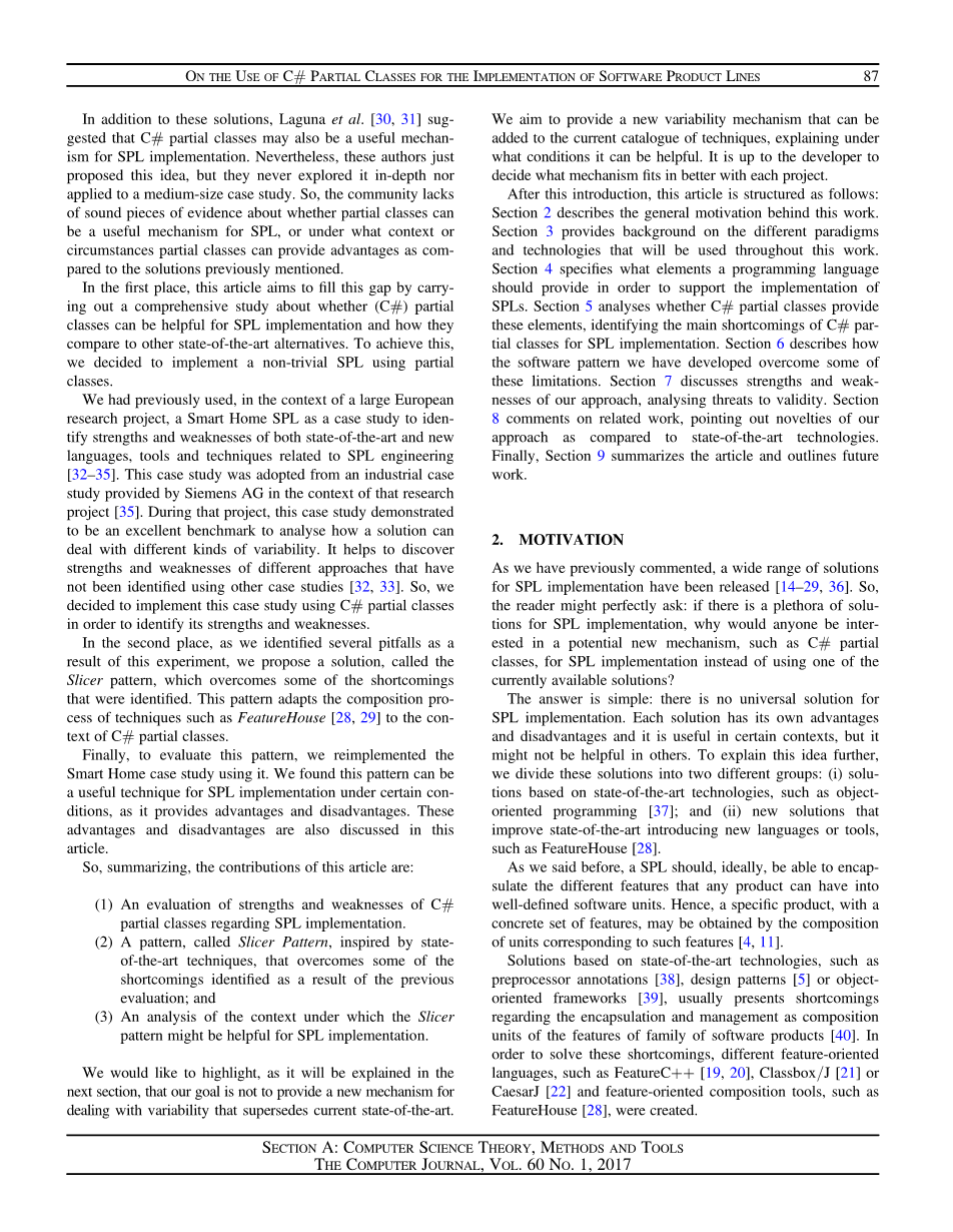 我们的目标是提供一个新的可变性机制,可以添加到目前的技术目录,解释在什么条件下它可以是有益的。开发人员可以决定哪种机制更适合每个项目。在此介绍之后,本文的结构如下:第2节描述了这项工作背后的一般动机。第3节提供了将在整个工作中使用的不同范例和技术的背景。第4节指定了编程语言应该提供哪些元素来支持SPLs的实现。第5节分析了c#部分类是否提供了这些元素,确定了c#部分类用于SPL实现的主要缺点。第6节描述了我们开发的软件模式如何克服这些限制。第7节讨论了我们方法的优缺点,分析了对有效性的威胁。第8节对相关工作的评论,指出我们的方法与最先进的技术相比的新颖之处。最后,第9节总结了本文并概述了未来的工作。