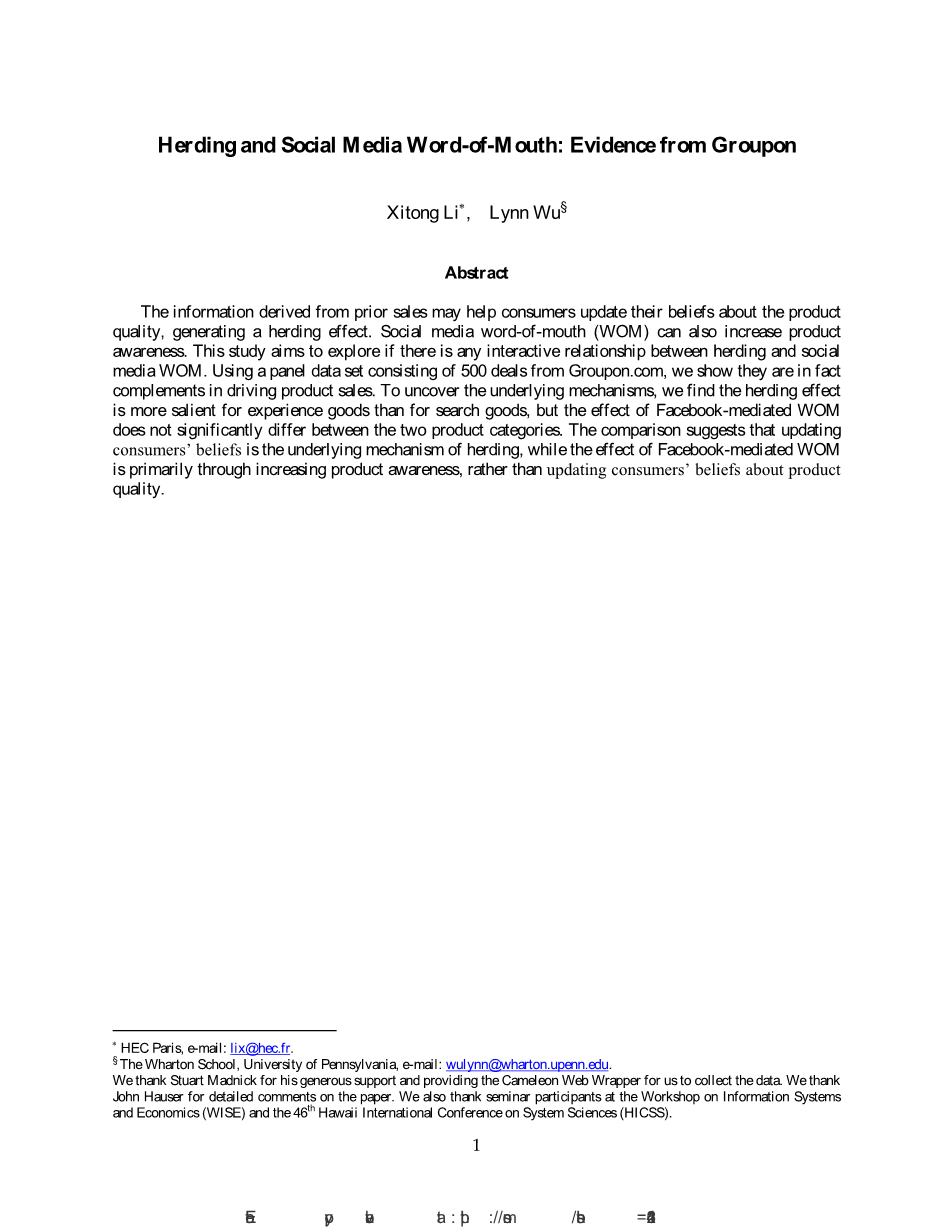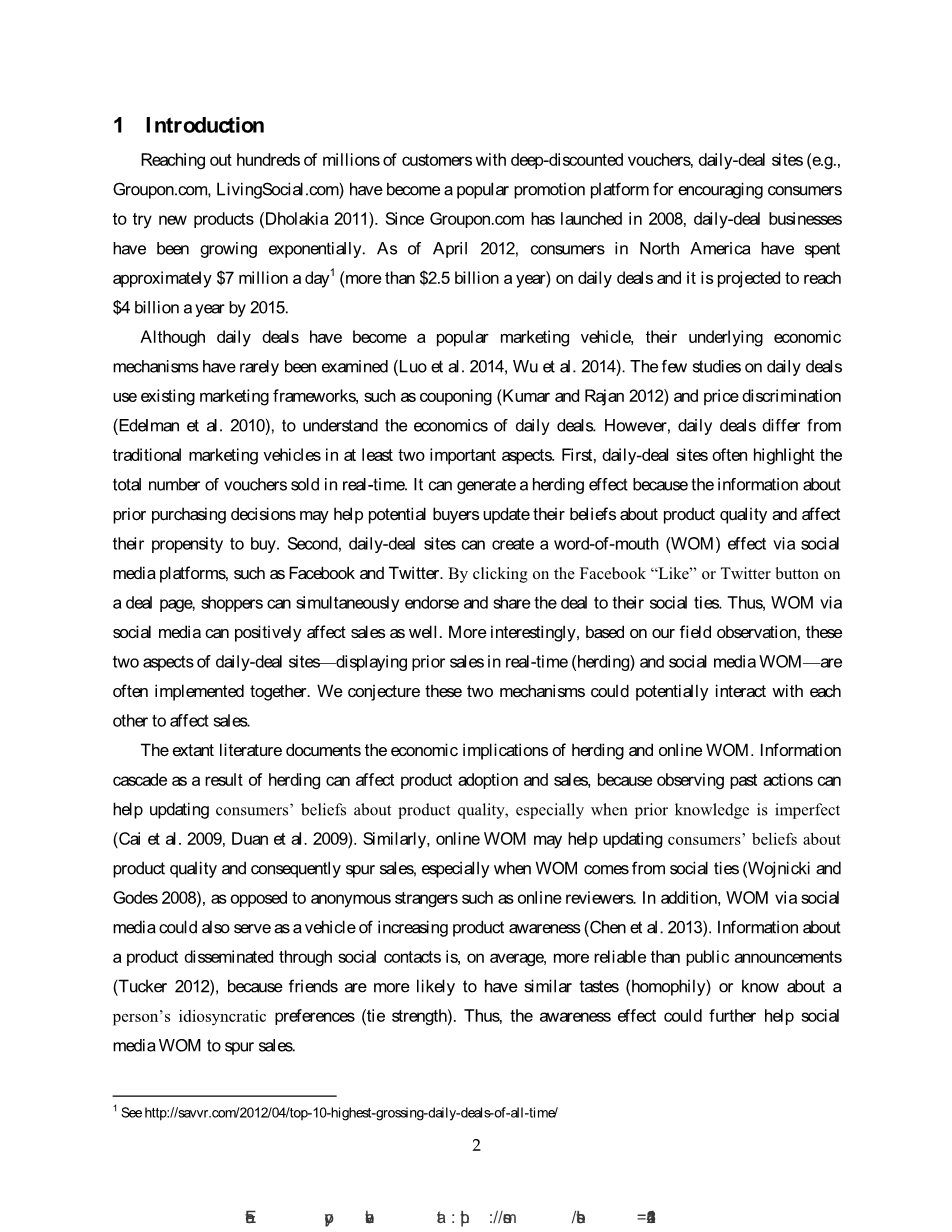 虽然每日交易已成为一种受欢迎的营销手段,他们潜在的经济机制很少被研究过(Luo等2014,Wu等2014)。关于日常交易的少数研究使用现有的营销框架,例如优惠券(Kumar和Rajan 2012)和价格歧视(Edelman等人,2010),以了解每日交易的经济学。然而,至少在两个重要方面,每日交易与传统营销工具不同。首先,每日交易网站通常会突出显示实时销售的凭证总数。它可以产生羊群效应,因为有关先前购买决策的信息可以帮助潜在买家更新他们对产品质量的信念并影响他们的购买倾向。其次,每日交易网站可以通过社交媒体平台(如Facebook和Twitter)创建口碑(口碑)效果。通过点击交易页面上的Facebook“赞”或Twitter按钮,购物者可以同时支持并与他们的社交关系分享交易。因此,通过社交媒体的口碑也可以对销售产生积极影响。更有趣的是,根据我们的现场观察,每日交易网站的这两个方面 - 实时显示(羊群效应)和社交媒体口碑 - 通常一起实施。我们推测这两种机制可能会相互影响,从而影响销售。