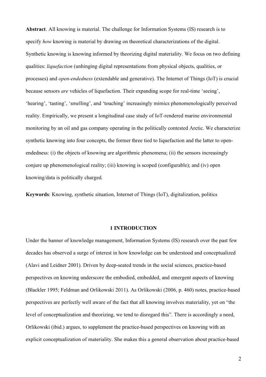 摘要:所有的认知都是物质的。信息系统(IS)研究面临的挑战是通过利用数字化的理论特征来说明认知是重要的。综合认识是通过对数字物质性的理论化而获得的认识。我们关注两个定义性质:液化(将数字表示与物理对象、性质或分离开来的过程)和开放性(可扩展和可生成的)。物联网至关重要,因为传感器是液化的载体。他们扩大了实时“观看”的范围,“听觉”、 “味觉”、“嗅觉”和“触觉”越来越多地模仿现象学意义上的现实。根据经验,我们提出了一个纵向案例硏究,由一家在政治上有争议的北极地区运营的石油和天然气公司进行物联网提供的海洋环境监测。我们将成知识描述为四个概念,前三个与液化相关,后者与开放相关:(ⅰ)认知的对象是算法现家;(ⅱ)传感器越来越多地是人联想起现象学现实;(ⅲ)认知范围(可配置);(iv)公开的知识/数据是政治性的。