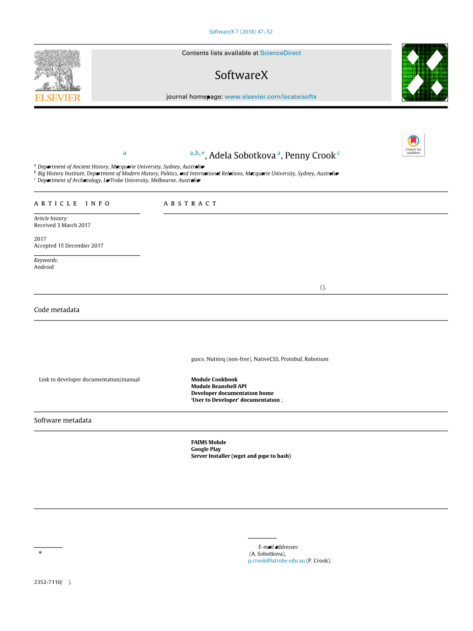 相对的,FAIMS Mobile是一个“通用”软件,它结合了现场研究所需的功能和足够的可定制性,允许跨学科使用,吸引足够大的用户群来支持其开发并对研究产生有意义的影响(参见章节4 ;[8]).它专为离线使用而设计,与大多数其他通用的现场数据采集软件不同,如ARK,Heurist或Kora [14],这些都需要连接到服务器。FAIMS Mobile是由Field Acquired Information Management Systems Project开发的开源软件,该项目是一个位于澳大利亚悉尼麦考瑞大学的电子研究基础设施项目。它是自2012年以来一直在开发的成熟软件(参见:[15–17]).