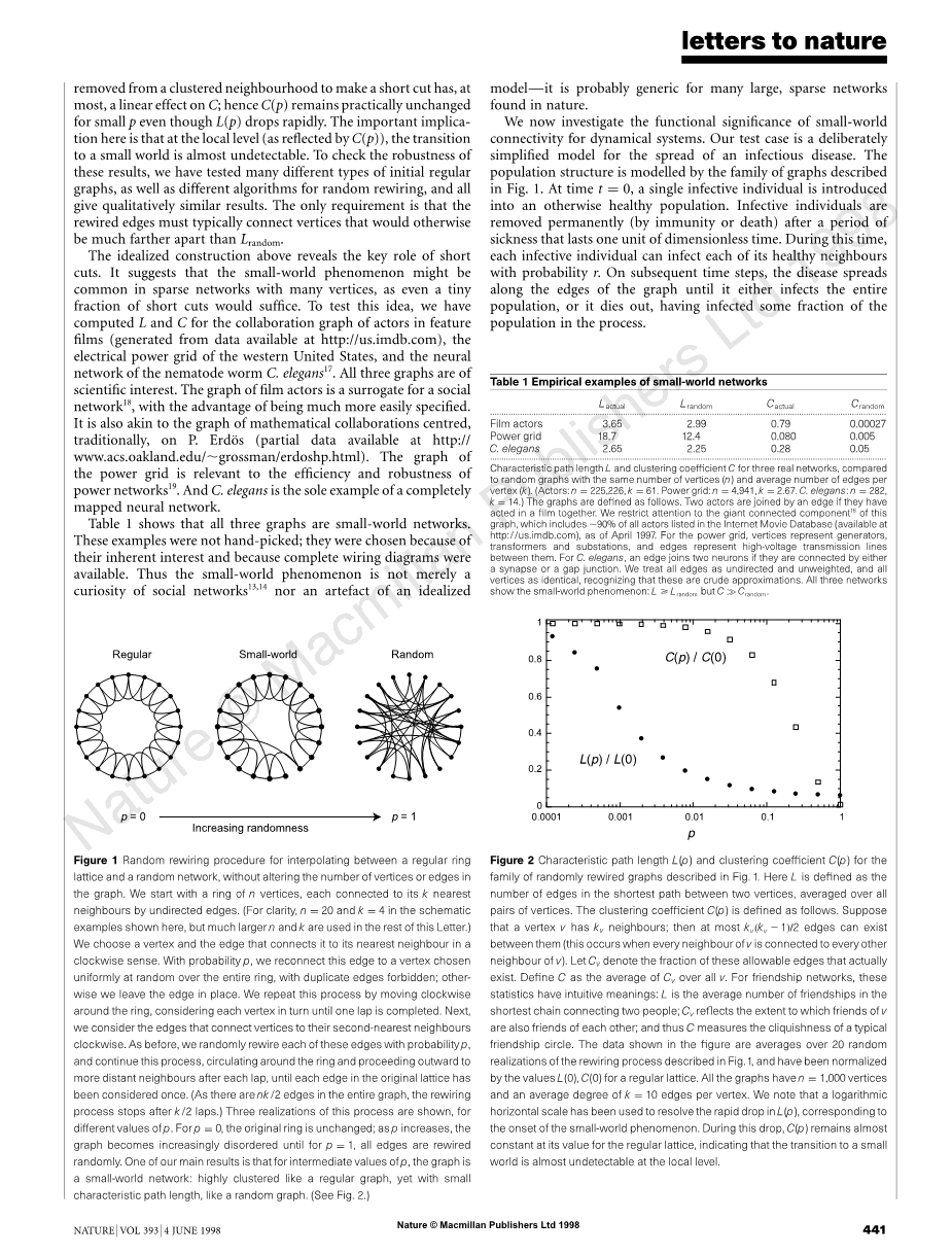 连结动力系统的网络已被用于为生物振荡器1-4、约瑟夫森结阵列5-6、应激介质7、神经网络8-10、时空博弈11、基因控制网络12以及许多其它自组织系统建立模型。通常,这些模型的拓扑结构被假定为完全规则网,或完全随机网。但许多生物网络、技术网络和社会网络却介于这两种极端的网络之间。在这里我们探究能够直达两种极端网络中间地带的简单网络模型:即通过重新连接规则网络中结点之间的连线来增加该网络的无规则性。我们发现这 些网络能够像规则网那样具有高度的集群性,又像随机网那样具有短的特征路径长度。由于具有类似小世界现象(即众所周知的六度分离15),我们把它们称为“小世界”网络13-14。蠕线虫的神经网络、美国西部的电力网络以及电影演员的协作网络已被证明是小世界网络。具有小世界连接的动力系统模型显示出能增强信号的传播速度、计算能力和同步能力。尤其是,传染性疾病在小世界网络中传播比在规则网络中要容易得多。
