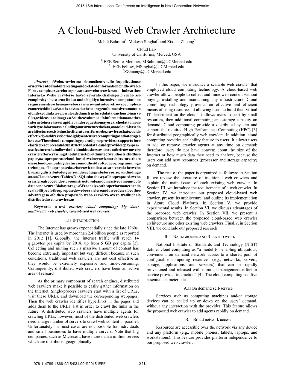 摘要— 网络爬虫作为工具为应用与服务在互联网网上检索有趣的和相关联的信息。举个例子,搜索引擎利用网络爬虫来索引整个互联网. 构造网络爬虫要面对一些挑战,如当网络爬虫想要检索具有复杂连接的链接时面对的链接和高密集度的计算需求的复杂性。 另一个问题是索引链接以及非结构化数据,如二进制文件,视频或图像所需要的巨量存储空间。 随着互联网上的信息量迅速增加,搜索请求可能以各种格式(包括非结构化数据)来搜索数据。因此在有关网络爬虫的文献中并不不存在有基于云的架构,可以有效地解决网络爬虫高度密集的计算和存储问题的文献。 云计算服务模型为弹性资源和非结构化数据提供支持,并提供按使用付费的功能。同时允许各个企业运行自己的网络爬虫来爬虫或限制网络主机。 在本文中,我们提出了一种基于云的网络爬虫架构,它基于云计算服务和MapReduce技术。 这样的网络爬虫程序允许我们使用分布式代理程序对互联网进行爬取,并且每个代理程序都将自己的查找结果存储在Cloud Azure Table(NoSQL数据库)中。同时该网络爬虫程序还可以在Azure Blob存储上存储非结构化和大量数据。 我们分析了所提出的网络爬虫的性能和可扩展性,并且描述了其优于传统分布式网络爬虫的优势。
