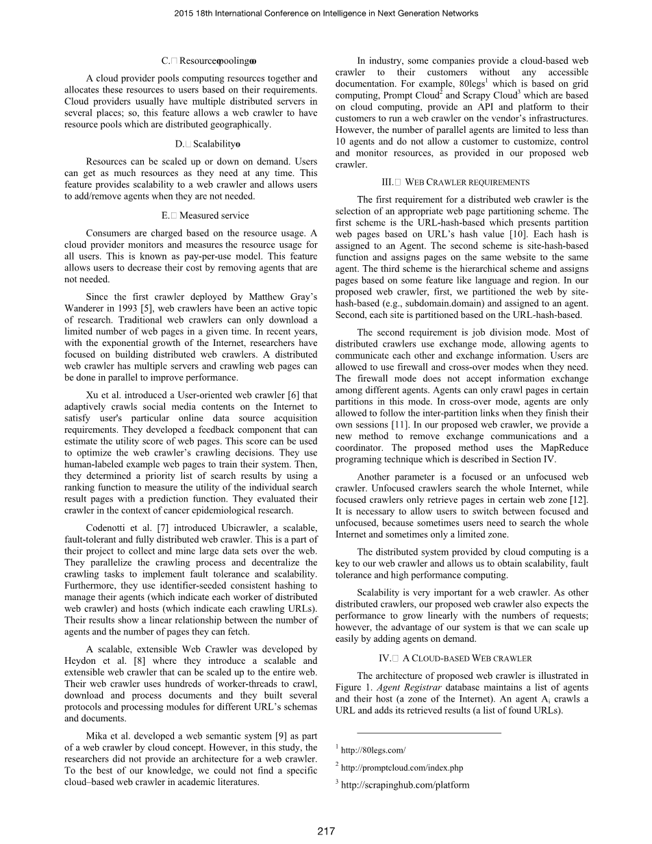 在本文中,我们介绍了一种采用云计算技术的可扩展Web爬虫。 基于云的Web爬虫程序允许人们收集和挖掘Web内容,而无需购买、安装和维护任何基础架构。 云计算技术提供了一种有效且高效的资源使用方式,它允许用户在云上构建其虚拟IT部门。 它允许用户从小资源开始,然后按需增加额外的计算和存储容量。 云计算服务为分布式地理网络爬虫提供分布式系统并支持所需的高性能计算(HPC)[3]。 此外,云计算服务还为用户提供了可扩展性功能。 它允许用户随时根据需要添加或删除爬虫代理; 因此,用户不必担心互联网的大小或需要分析多少数据,因为用户可以按需添加新资源(处理器和存储容量)。