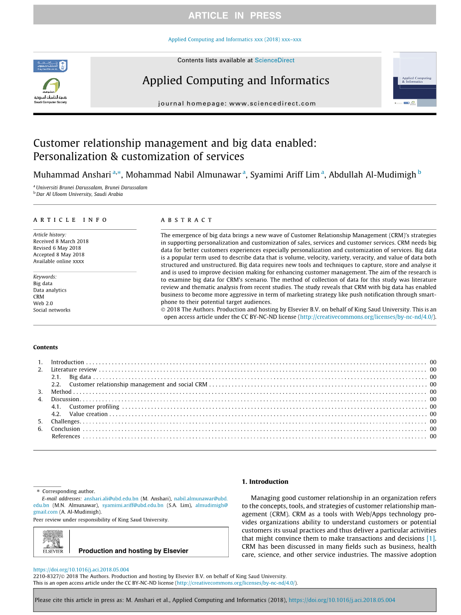 大数据的出现带来了新一轮的客户关系管理(CRM)战略,支持个性化和定制销售,服务和客户服务。CRM需要大数据以获得更好的客户体验,尤其是个性化和服务定制。大数据是一个流行术语,用于描述数据,即结构化和非结构化数据的数量、速度、种类、准确性和价值。大数据需要新的工具和技术来捕获,存储和分析它,并用于改进决策以增强客户管理。该研究的目的是检查CRM场景的大数据。本研究的数据收集方法是文献综述和近期研究的主题分析。该研究表明,拥有大数据的CRM使企业在营销策略方面变得更加积极,如通过智能手机向潜在目标受众推送通知。