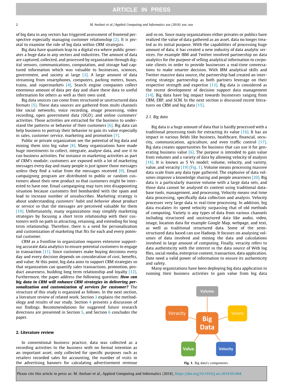 CRM作为组织的前沿需要广泛的支持准确的数据分析,以确保潜在客户参与交易[11]。由于客户每天都做出购买决策,每个决策都取决于对成本,收益和价值的考虑。此时,大数据旨在支持CRM战略,以便组织可以量化销售交易,促销,产品意识,建立长期关系和忠诚度[12]。此外,本文还提出了以下问题:CRM中的大数据如何在为客户提供个性化和定制服务的过程中增强CRM策略?本研究的结构安排如下。在下一节中,对相关工作进行文献综述。第3部分解释了我们研究的方法和结果。第4部分讨论我们的发现。未来研究方向的建议见章节5和部分6该论文结束。