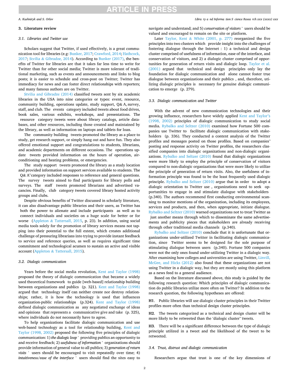 需要相关的理论框架,并应借鉴最佳做法。 以前的研究集中在研究图书馆使用Twitter的方式(例如。 :掩体,2017年; 克劳福德,2014年; 斯塔尔, 2010 年; Stviliaamp; 吉布拉德兹, 2014 年) 。 然而, 关于Twitter在发展和维护长期积极的图书馆-公共关系中的作用的研究相当有限,需要扩大。