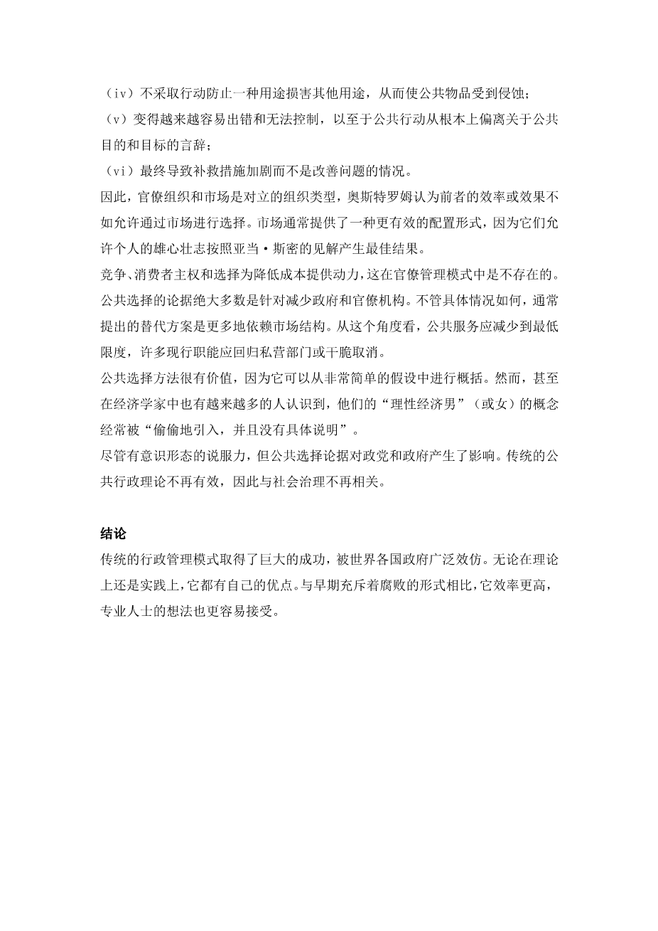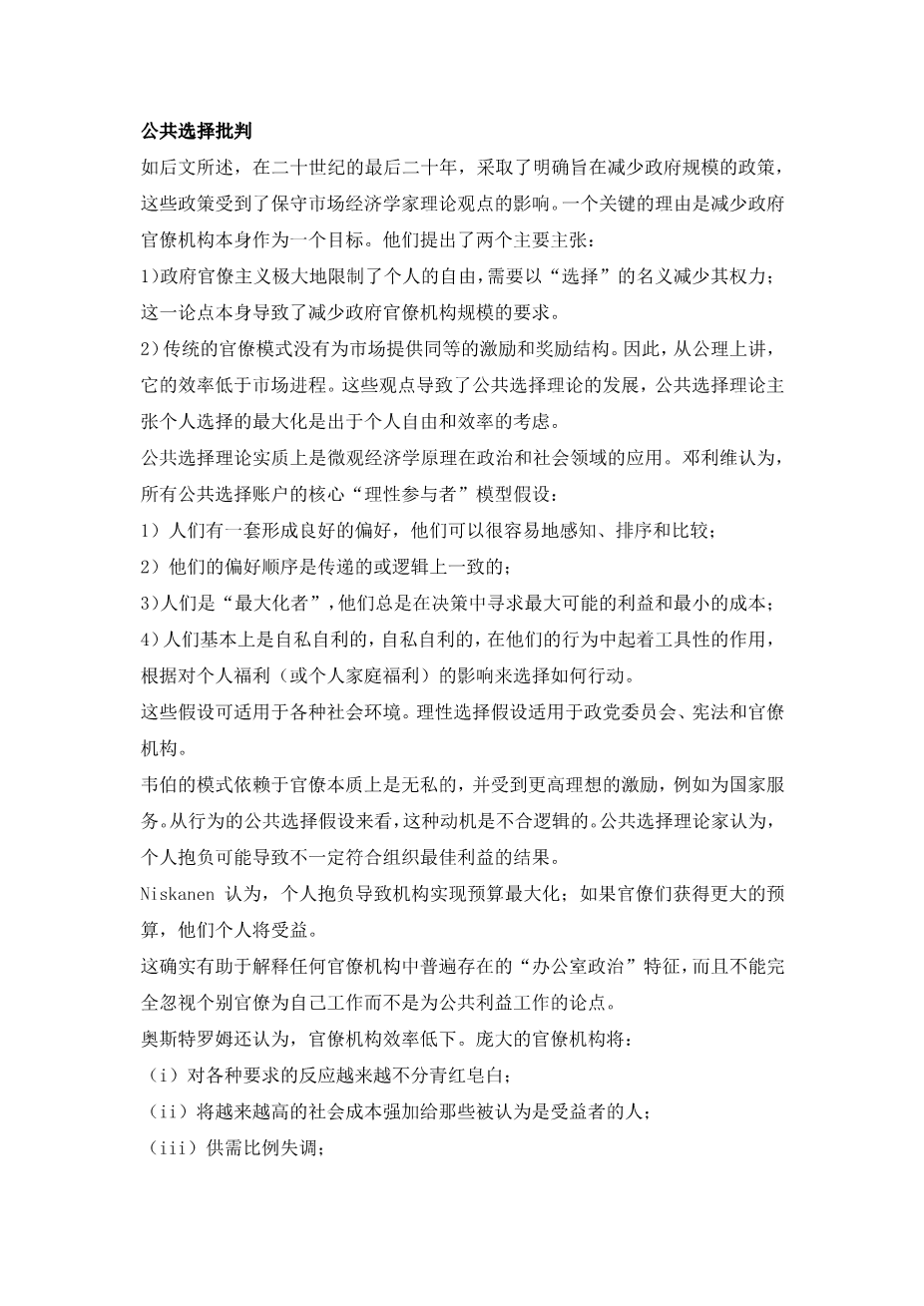 2) the traditional bureaucratic model did not provide an equivalent structure of incentives and rewards to those of the market. It was, therefore, axiomatically less efficient than market processes. These views led to the development of public choice theory, which argues for the maximization of choice by individuals for reasons of individual freedom and efficiency.