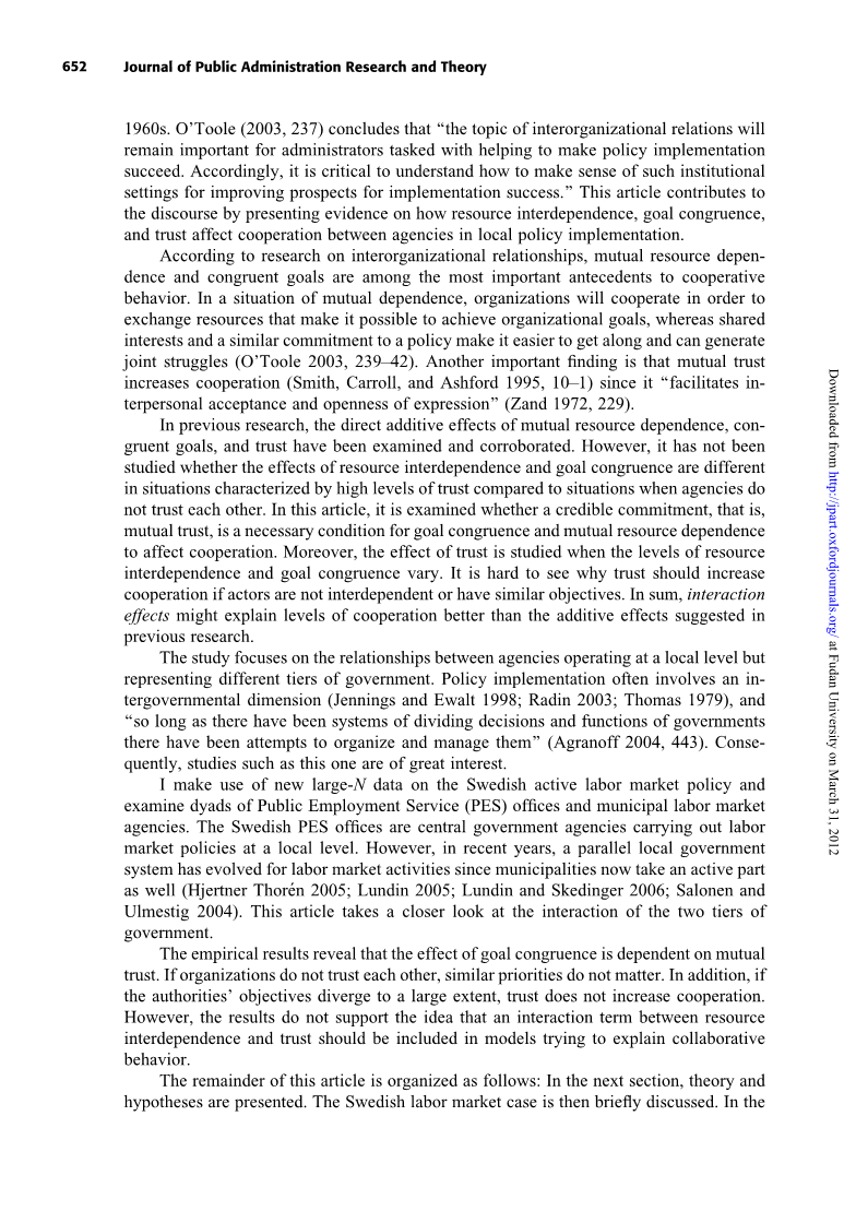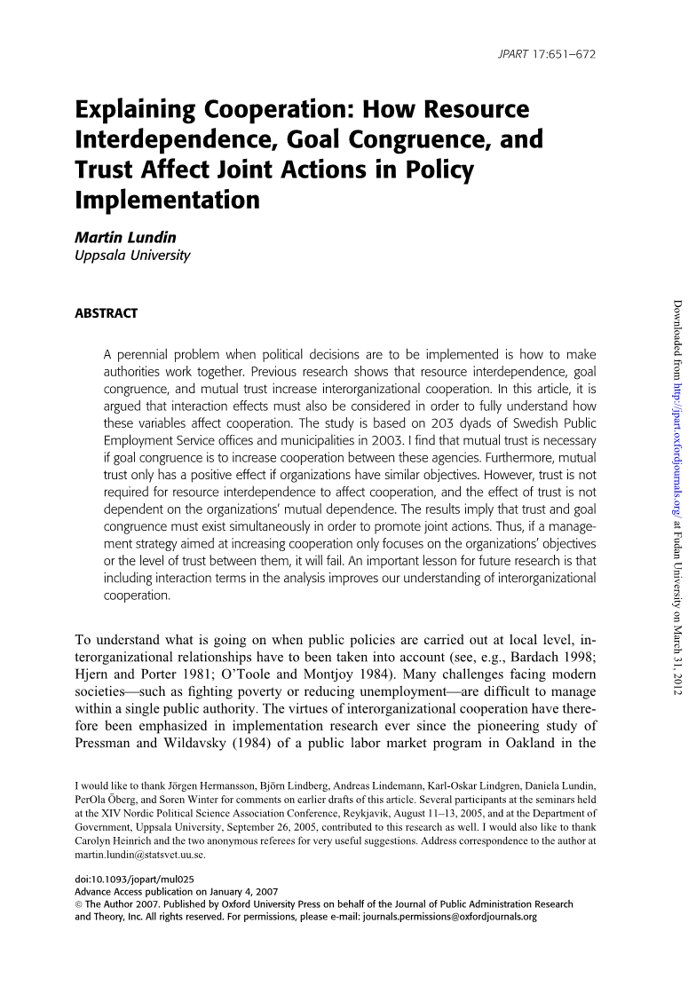 当公共政策在当地层面执行时,为了明白是怎么回事,在组织间的相互关系中必须被考虑(例如,巴达克1998;赫津和波特1981年;奥图尔和蒙乔1984年)。现代社会面临诸多挑战像消除贫困和减少失业这样的社会是很难管理的在单一的公共机构内。因此一直强调企业间合作的优点实现研究的开创性研究以来普鲁埃斯曼和威尔达夫斯基(1984)在奥克兰1960年代的公共劳动力市场计划。奥图尔(2003, 237)认为“组织间关系的主题将会对于负责帮助实现策略的管理员来说仍然很重要成功。因此,理解如何理解这种制度是至关重要的改善实施成功前景的设置。这篇文章对通过提供资源相互依赖,目标一致,信任影响机构间在地方政策执行中的合作。