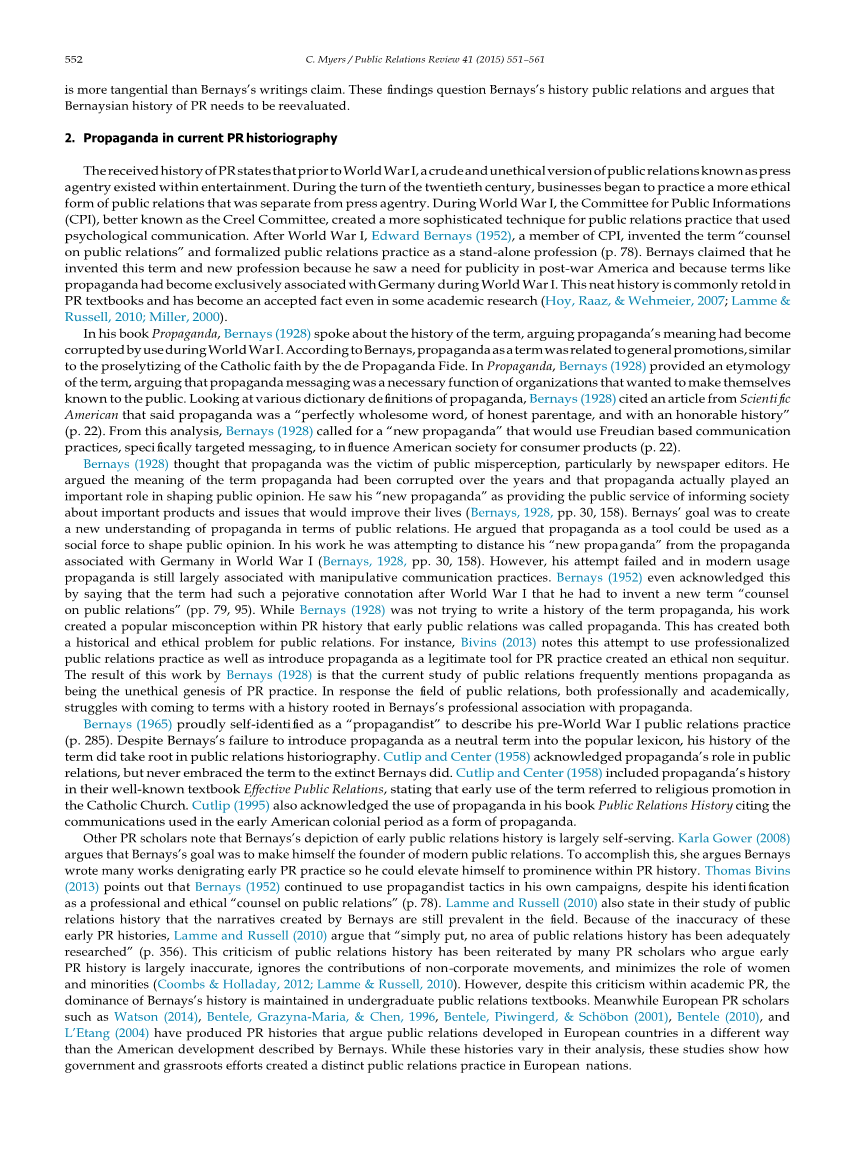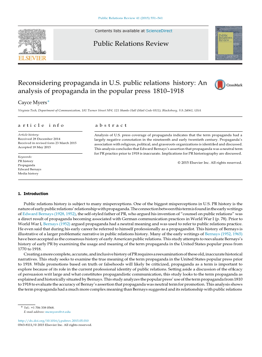 对美国新闻报刊中关于宣传的分析表明,“宣传”一词在19世纪到20世纪初有很大的负面含义。研究确定并讨论了宣传与宗教、政治和基层组织之间的联系。这项分析的结论是,Edward Bernays的观点,“宣传在1918年以前,对于公关实务来说是一个中性术语”是不准确的。公共关系史学的意义被广泛讨论。