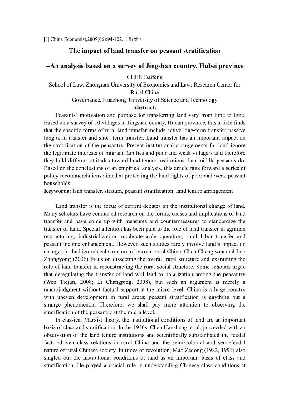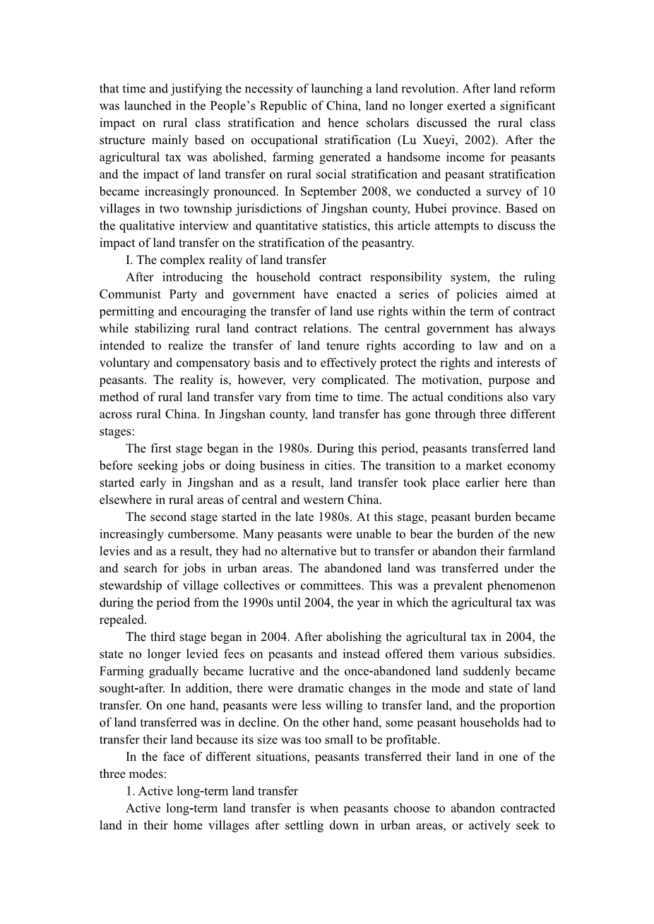 土地流转对农民阶层分化的影响 ——基于湖北省京山县调研的分析外文翻译资料