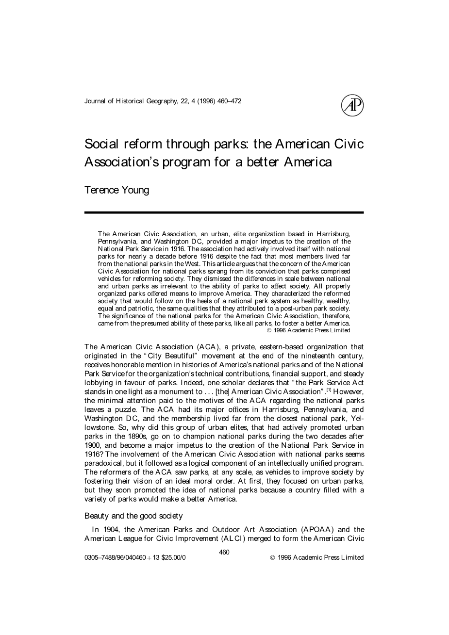 美国公民协会(ACA)是一个始于19世纪末的“美丽城市”运动的私营东部组织,在美国国家公园和国家公园管理局的历史中荣获该组织技术贡献,财政支持以及有利于公园的稳定游说。 事实上,一位学者宣称:“公园服务法案是一盏灯作为纪念碑。” 然而,对ACA关于国家公园的动机的最小关注留下了难题。ACA在哈里斯堡,宾夕法尼亚州和华盛顿特区有其主要的办公地点,其成员的居住地离最近的国家公园黄石公园很远。那么,为什么在19世纪90年代积极推动城市公园的城市精英群体为何在1900年后的二十年中争夺国家公园,并成为1916年创建国家公园服务的主要动力? 美国公民协会与国家公园的参与似乎是自相矛盾的,但随后它成为智力统一计划的逻辑组成部分。ACA的改革者们将任何规模的公园看作是通过培育他们对理想道德秩序的理想来改善社会的工具。 起初,他们专注于城市公园,但他们很快就提出了国家公园的想法,因为一个拥有各种公园的国家会让美国变得更美好。