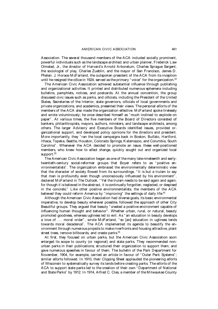 1904年,美国公园和户外艺术协(APOAA)和美国民事改善联盟(ALCI)合并组成美国公民委员会协会。ACA的数千名成员包括社会突出,强大的个人,如景观设计师和城市规划师,Frederick Law Olmsted,Jr.,哈佛大学阿诺德植物园主任,查尔斯斯普拉格萨金特,游戏社会学家Charles Zueblin和James D.费伦,HoraceMcFarland,ACA直言不讳的总裁,从1924年开始直到他辞职,成为该组织的主要“声音”。美国公民协会通过出版和组织活动取得了实质性的影响。 它印刷和发行了许多刊物,包括公告,小册子,通知和明信片。在年度大会上,该小组讨论了公园问题,包括美国总统,内政部长,州长,地方政府和私人组织以及学者等公民问题,并介绍了他们的观点。ACA成员的个人福利也使该组织发挥了作用。麦克法兰德不知疲倦地说,写了大量的的材料,他曾形容自己“很可能在纸上爆炸”。在不同时间,董事会的五名成员由银行家,慈善家,市长,作者,部长和景观设计师等组成。