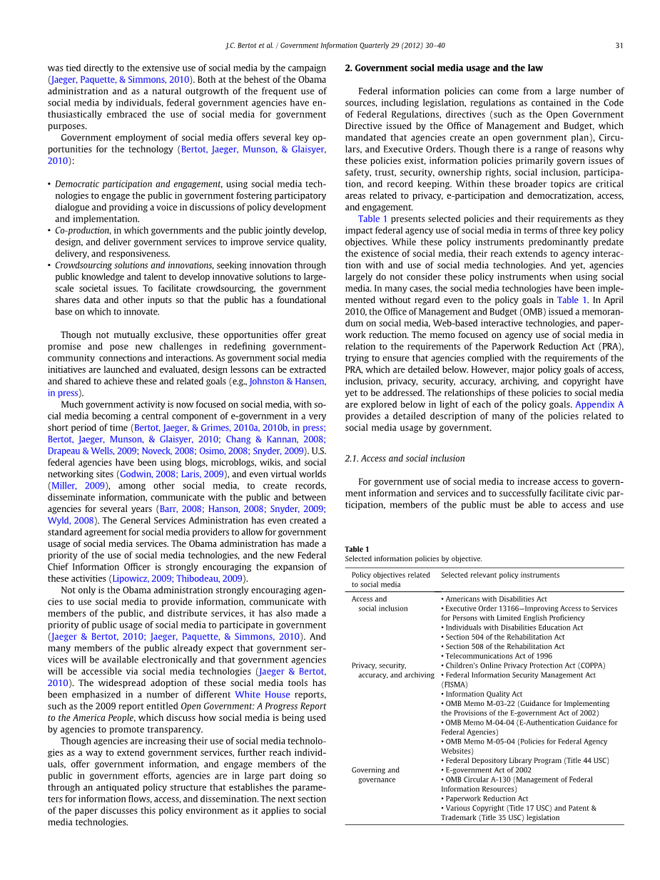 尽管机构增加他们使用社会媒体technolo-gies来扩展政府服务,进一步达到individ-uals,提供政府信息,和公众参与政府的努力,机构这样做在很大程度上是通过一个过时的政策结构,建立了信息流动的复健,访问和传播。本文的下一部分将讨论这一政策环境,因为它适用于社交媒体技术。