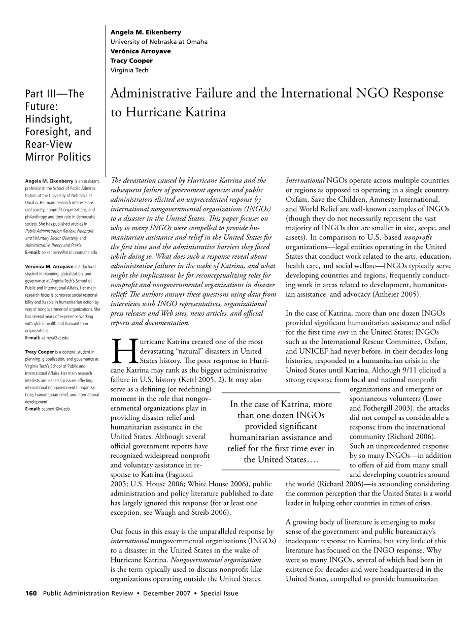 卡特里娜飓风造成了美国历史上最具破坏性的“自然灾害”之一。对卡特里娜飓风的不良反应可能是美国史上最大的行政失误(Kettl 2005,2)。它也可能在非政府组织在向联合国提供救灾和人道主义援助方面起到决定性作用。然而政府的几份官方报告承认,广泛的非营利和自愿援助是为了对卡特里娜飓风的响应(法格诺尼2005;美国2006;白宫2006),迄今为止出版的政府部门和政策文献基本上忽略了这一反应。