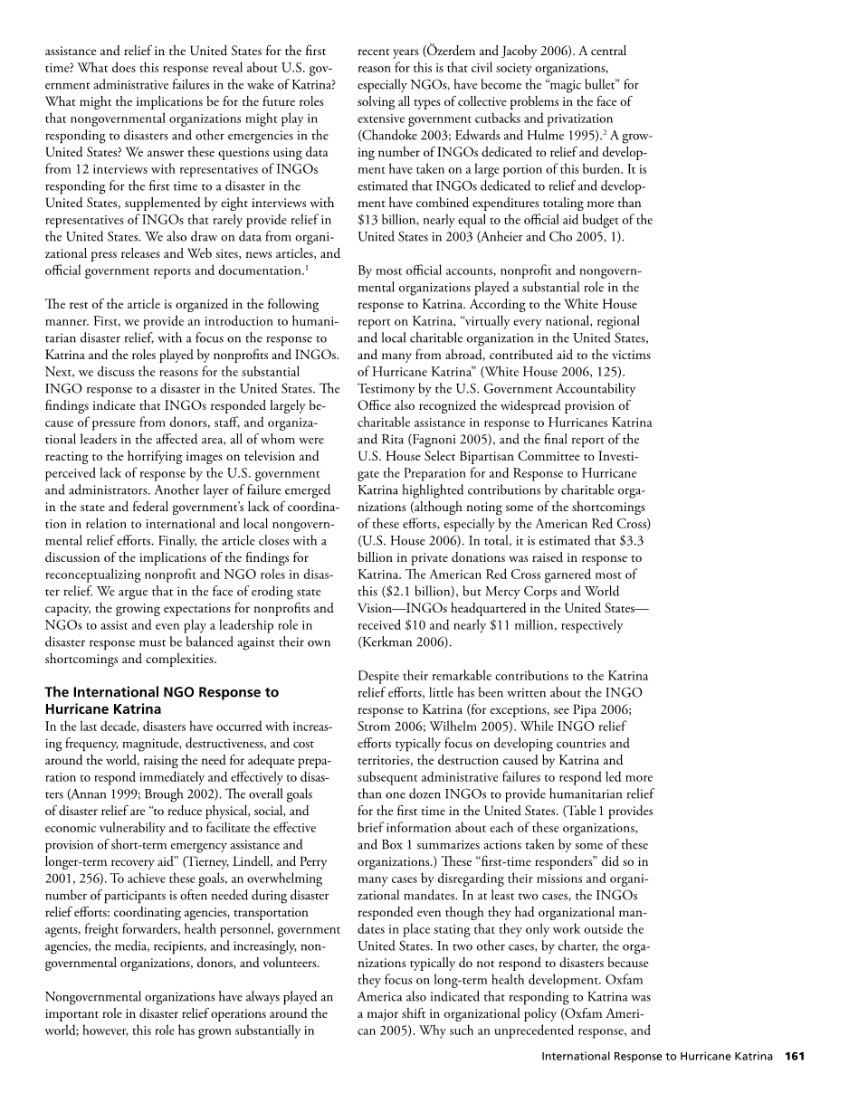本文的重点是国际非政府组织(INGOS)对卡特里娜飓风后美国灾难的空前反应。非政府组织通常用来讨论非营利组织,如在美国以外运作的组织。国际非政府组织在多个国家或地区开展业务,而不是在一个国家开展业务。乐施会、拯救儿童组织、大赦国际和世界救济组织都是国际非政府组织的著名例子(尽管它们不一定代表绝大多数规模、范围和资产较小的非政府组织)。与以美国为基地的非营利组织相比——在美国从事与艺术、教育、保健和社会福利有关工作的法律实体——国际非政府组织通常为发展中国家和区域服务,经常在与发展、人道主义援助和宣传有关的领域开展工作(Anheier 2005)。