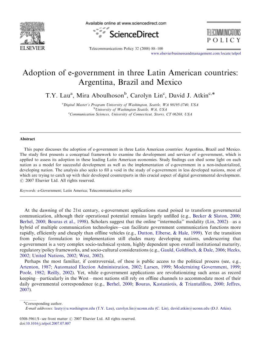 本文论述了采用电子政务的三个最大的拉美国家——阿根廷、巴西和墨西哥的问题,这个问题十分紧迫。分析首先回顾一个概念性的框架来研究电子政务的开发和服务,这将被应用在这三个地方。研究结果有助于揭示电子政务在发展中拉美国家的成功的发展模式的实施方案。本文还试图填补一个研究电子政务在欠发达国家的空白,现在试图赶上发达国家同行在这个数字政府开发的脚步。