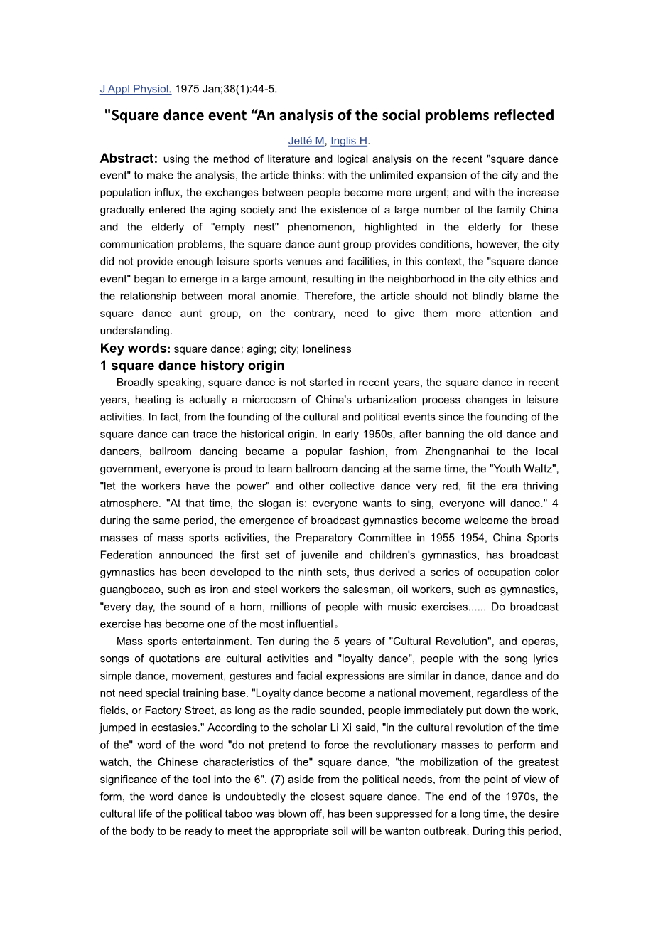种群众性体育娱乐活动。[5]“文化大革命”十年期间,和样板戏、语录歌并列的文化活动还有“忠字舞”,人们在跳舞时配合与歌曲歌词相仿的简单舞步、动作、手势、表情,不需要特别的舞蹈基础和训练。“忠字舞发展成为一种全民运动,无论田间地头,还是工厂大街,只要广播响起,人们就立即放下手中的工作,如醉如痴地跳起来。”[6]按照学者李熙的说,“文革时代的lsquo;忠字舞rsquo;不加掩饰地强制lsquo;革命群众rsquo;演出和观看,将中国特色lsquo;广场舞rsquo;的动员工具意义放到最大”。[7]抛开政治需求不谈,单从形式来看,“忠字舞”无疑是最接近广场舞的。20 世纪 70 年代末,文化生活的政治禁忌被轰然解除,被压抑已久的身体欲望蠢蠢欲动,遇到合适的土壤便会肆无忌惮的爆发出来。这一时期,交际舞再次回潮,而且逐渐发展成一种在公园、街道随处可见的中老年健身休闲活动。从阶级斗争到政治需要,交际舞终于张开了其为大众健身休闲服务的本色。不同于广场舞的是,当时的舞曲更趋于平缓、抒情,代表了人们对过去时代的反思,《大海啊我的故乡》等曲子是那个时代的代表。而对身体解放渴望最为强烈的当属那个时代的青年,迪斯科( disco) 无疑是年轻人的最爱,狂热的动作彻底颠覆了传统形而上的含蓄、典雅和庄重。在迪斯科的纵情律动中,身份、地位被彻底抛弃,人们忘情于迪斯科的性感、狂热和放肆,也因此,迪斯科成为相对交际舞而言的“坏”舞蹈。“每到傍晚,成千上万的青年男女提着录音机,涌进公园大跳迪斯科,人员的密集程度快把公园涨满了。震耳的迪斯科音乐、湖边和林中无数跳舞的男女,飞扬的尘土,成为京城从未有过的一大奇观。” [8]从2008 年黑龙江佳木斯市民的第一套自编现代广场舞开始,数年间,广场舞成为中老年人交流、锻炼、休闲的最佳活动而席卷全国,甚至舞出国门,在纽约、伦敦、莫斯科展示“最炫民族风”。