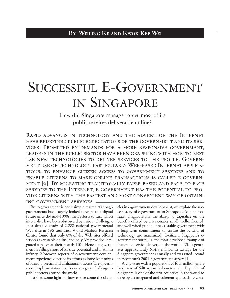 为了阐明如何克服在电子政务发展中遇到的障碍,我们探讨了新加坡电子政务的成功故事。作为一个民族国家,新加坡可以利用相当小、信息灵通且有良好关系的公众所提供的优势。它拥有一个稳定的政府,长期致力于确保技术的利益最大化。新加坡电子政务门户网站E-citizen是“全球综合服务供给最发达的楷模”,它每年可以为新加坡政府节省约1450万美元,并在埃森哲2001年的电子政务调查中被评为第二。