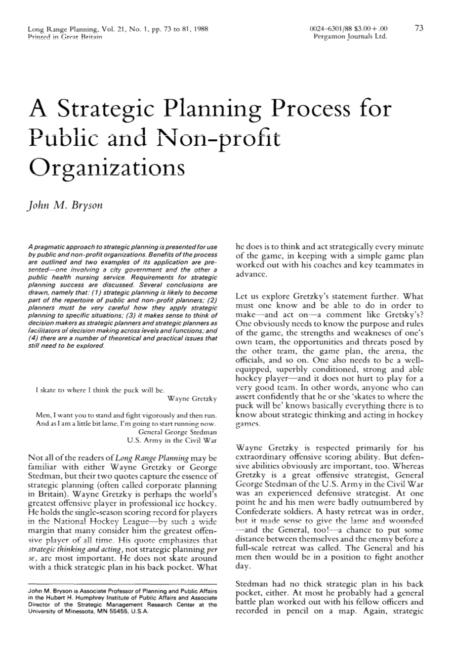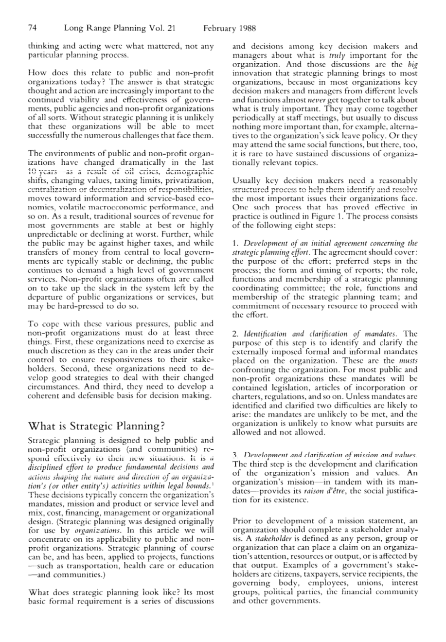 摘要:本文提出了一种实用的战略规划方法,供公共和非营利组织使用,并概述了这一过程的好处,给出了两个应用实例——一个涉及市政府,另一个涉及公共卫生护理服务。讨论了战略规划成功的要求,得出以下几个结论:(1)战略规划很可能成为公共和非营利规划者的一部分;(2)规划者必须非常小心地将战略规划应用于具体情况;(3)将决策者视为战略规划者,将战略规划者视为跨层次和跨职能决策的推动者;(4)还有许多理论和实践问题需要探讨。