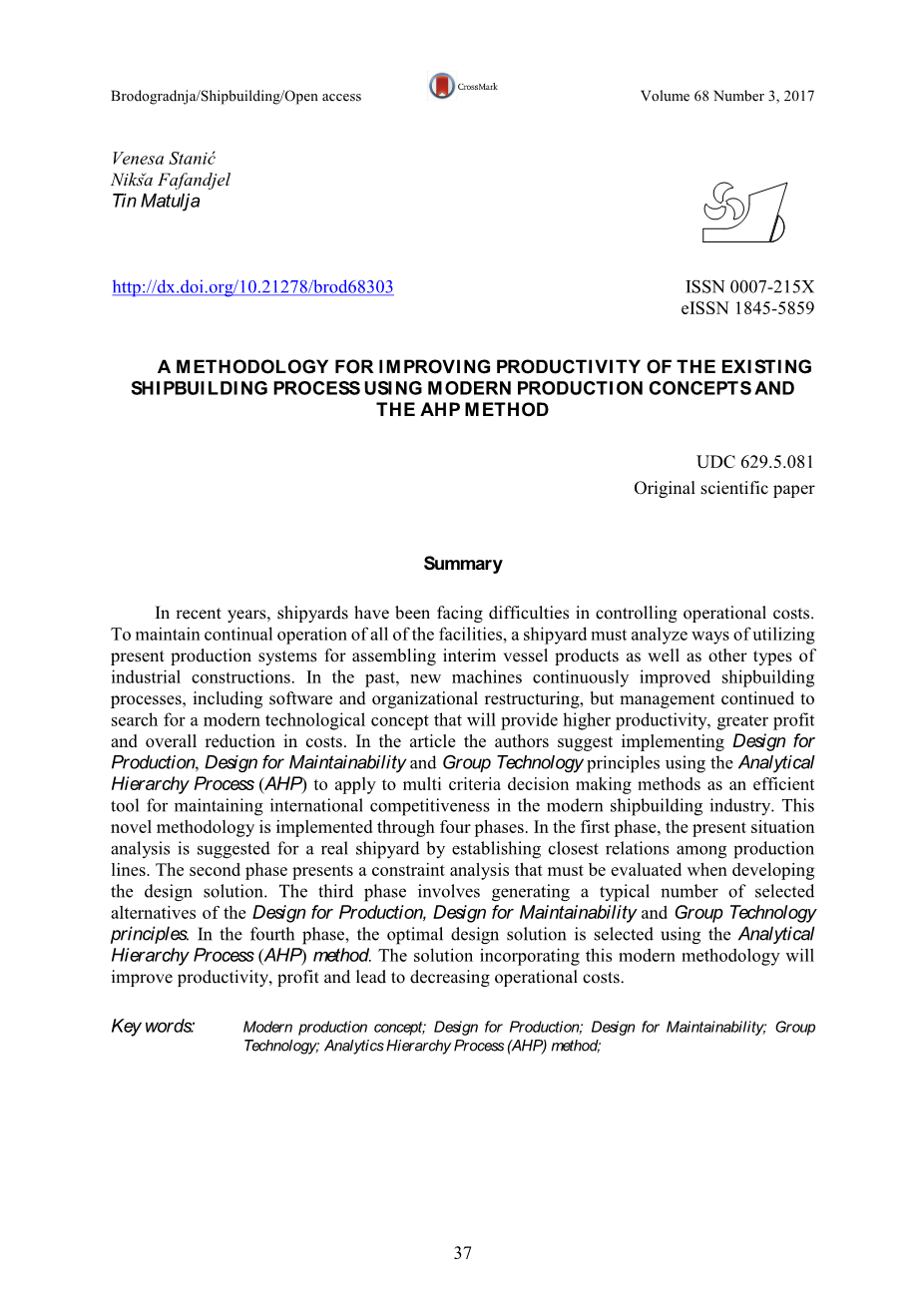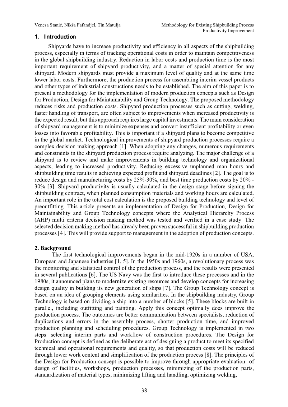 船厂必须提高造船过程各方面的生产力和效力,特别是在跟踪业务成本方面,以保持全球造船业的竞争力。降低人工成本和生产时间是船厂生产力的最重要要求,也是船厂所特别关注的问题。现代船厂必须提供最高水平的质量,同时降低劳动力成本。此外,还需要建立装配临时船只产品和其他工业建筑的生产工艺。本文的目的是提出一种实现现代生产概念的方法,如生产设计、可维护性设计和成组技术。所提出的方法减少了风险和生产成本。造船厂的生产过程,如切割、焊接、运输的快速处理,往往是在提高生产力是预期的结果时进行的,但这种方法需要大量的资本投资。船厂管理的主要考虑是尽量减少费用,将盈利能力不足甚至亏损转化为有利的盈利能力。这是很重要的,如果造船厂计划在全球市场上具有竞争力。船厂生产工艺的技术改进需要一个复杂的决策方法[ 1 ]。在进行任何更改时,船厂生产过程中的许多要求和限制需要分析。船厂面临的主要挑战是审查和改进建筑技术和组织方面,从而提高生产力。减少超出计划的工时和造船时间,最终实现预期利润并能够在造船厂的最后期限内完工[ 2 ]。我们的目标是将设计和制造成本降低25% - 30%,最佳生产成本降低20% - 30%(3)。造船厂在签订造船合同之前,通常是在设计阶段计算生产力,计算出消耗的材料和工时。计算成本的一个重要作用是分析建造技术和附件装配水平。本文介绍了一种生产设计、维修性设计和成组技术概念的实现方法,并用实例分析了层次分析法(AHP)多准则决策方法。选定的决策方法已在造船生产过程中被证明是成功的[ 4 ]。这将为管理层采纳生产概念提供支持。