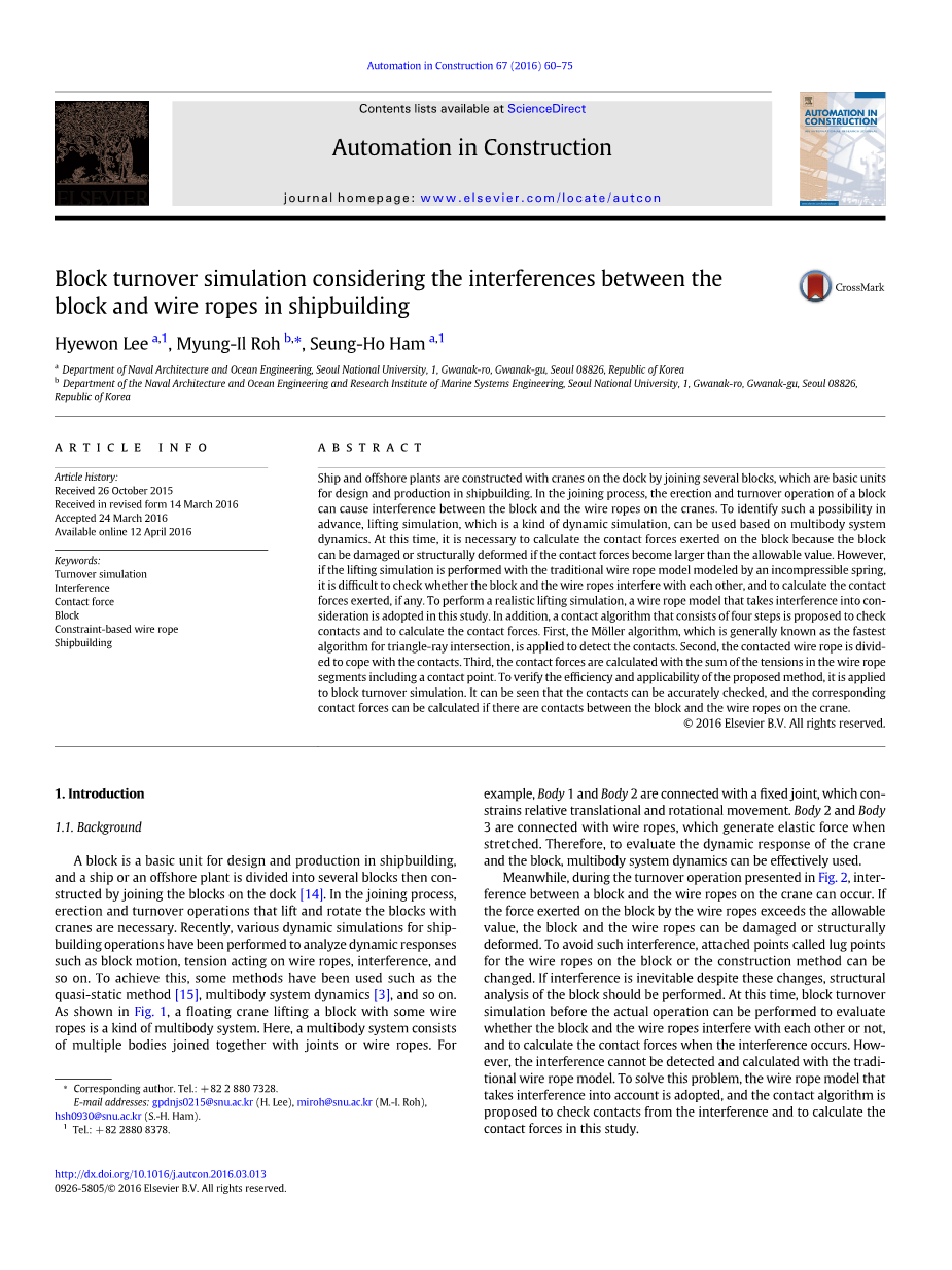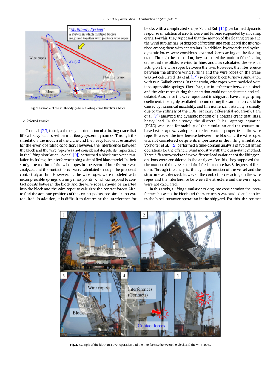 Cha等人分析了基于多体系统动力学的浮式起重机的动力学运动,该浮动式起重机能够提升重负荷。通过仿真,对于给定的操作条件估计起重机的运动和重载。然而,尽管在提升模拟中它的重要性,但没有考虑船体分段与钢丝绳之间的干涉。Jo等人使用简化的船体分段模型进行包括干扰的船体分段转换模拟。在他们的研究中,分析了钢丝绳在发生干涉时的运动情况,并通过所提出的接触算法计算了接触力。但是,由于钢丝绳是用不可压缩的弹簧来模拟的,所以应在船体分段和钢丝绳中插入与船体分段和钢丝绳之间的接触点对应的虚质量点,以计算接触力。另外,为了找到接触点的准确位置,需要进行预模拟。另外,难以确定形状复杂的块的干涉。 Ku和Roh对浮式起重机吊装的海上风电机组进行了动态响应仿真。为此,他们认为浮式起重机和风轮机的运动具有14度的自由度,并考虑了它们之间的相互作用与约束。另外,流体静力和流体动力被认为是作用在浮式起重机上的外力。通过仿真,他们估算了浮吊和海上风机的运行情况,并计算了两者之间钢丝绳的张力。然而,海上风机与起重机上的钢丝绳之间的干扰并未计算出来。 Ha等人用两台巨形起重机进行了船体分段翻转模拟。在他们的研究中,钢丝绳用不可压缩的弹簧模拟。因此,无法检测和计算在操作过程中船体分段与钢丝绳之间的干涉。另外,由于造船厂使用的钢丝绳具有较大的弹性系数,模拟过程中的高度振荡运动可能由数值不稳定性引起,并且这种数值不稳定性通常是由于ODE(常微分方程)的刚度造成的。 Ham等人分析了浮式起重机的动力学运动,可以提升重负荷。在他们的研究中,采用离散的欧拉 - 拉格朗日方程(DELE)进行模拟的稳定性,并采用基于约束的钢丝绳来反映钢丝绳的各种性能。然而,尽管其在提升模拟中的重要性,但并未考虑船体分段与钢丝绳之间的干涉。 Vorhouml;lter等人用准静态方法对海上风电行业的典型起重作业进行了时域分析。分析中考虑了三种不同的容器和两种不同的提升操作负载变化。为此,他们认为船舶和升降结构的运动具有8个自由度。通过分析,推导出船舶和结构动力学运动;然而,没有计算作用在钢丝绳上的接触力以及该结构和钢丝绳之间的干涉。