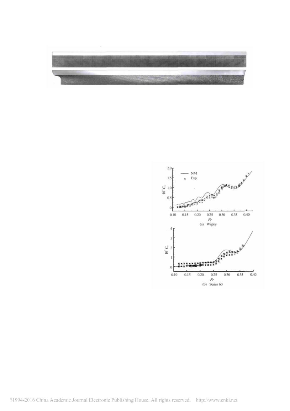 NM理论对Cw(以及船体周围流动的其他特征)产生了现实的预测,如现在对经典的Wigley抛物壳和图1所示的60系列(Cb = 0.6)模型所示。该图显示了用于流量计算的Wigley和Series 60船体的边y 0近似8 000个三角形平板。图2描述了参考文献[5-7]中报告的剩余阻力的实验测量(Exp。),以及由NM理论(NM)给出的Wigley船体(顶部)和图1所示的Series 60模型(底部)给出的波浪阻力(通过整合船体表面的流动压力确定)的预测。对于NM流量评估和图2中所示的实验测量,Wigley和Series 60船体在静止平衡位置(不允许下沉或修剪)保持“固定”。摩擦阻力Cf的实际估计值经典的ITTC摩擦配方给出了平滑的船体表面