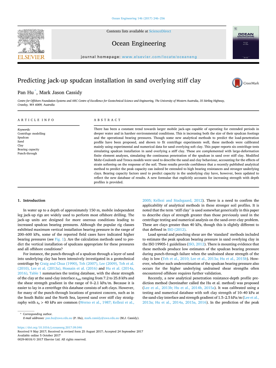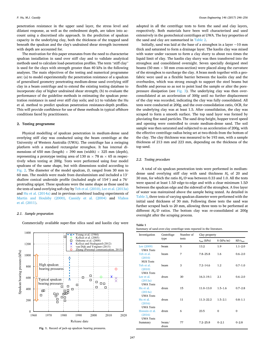 在ISO 19905-1准则(ISO, 2012)中,负荷扩散和冲剪是估算出砂覆盖粘土的峰值压力的“标准”方法。越来越多的证据表明当粘土的不排水抗剪强度很低时,因低估了桩腿支承压力,这些方法在击穿实验中以失败告终 (格兰et al .2010;李et al .2013;胡et al .2015 b)。