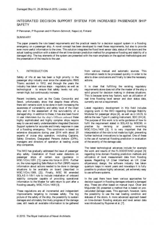 本文基于需要以及实际需求提出了一种客船进水应急决策支持系统的方案。为了满足这些要求,并给船员提供更有用的信息,我们提出了一种新的概念。该解决方案将进水水位传感器数据, 门的状态和实际装载情况,和受损船舶持续进水及稳定性的最新时域预测方法相结合。本文主要描述应用的研究方法和用户结果展示这两个系统的关键要素通。