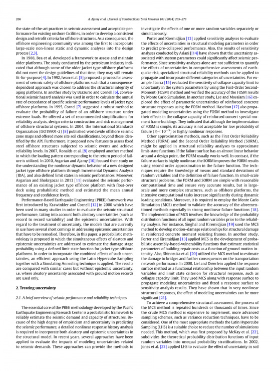 1988年,Bea等人开发了一个框架来评估和维护老平台。石油工业工业研究所进行的研究尽管一些较老的导管架式海上平台没有达到当时的设计准则,他们可能还会保留吗定制[4].In1992 Iwanetal。[5]提出了一种海洋平台地震安全性评估的方法,其结果是选择依赖方法来解决结构完整性问题老化的平台。在Bazzurro和Cornell[6]的另一项研究中,采用常规地震危险性分析来计算年际地震危险性导管架式比地震性能水平的超过率海上平台。1995年,Cornel[7]提出了一种鲁棒方法评估海底结构的失效概率极端负载。他提出了一套推荐的简化方法可靠性分析、设计准则的制定和风险管理离岸结构体系的。2004年,国际标准组织(ISO19901-2)[8]在全球范围内发表了《海上地震》区域地图和提供更多的现场土壤分类,超越那些iden-由API整理。此外,还提出了评价固定资产的新特征钢结构海洋结构在地震作用下的抗震性能可靠性水平。2007年,Ronalds等人采用了另一种方法其中加载模式对应于故障的返回周期-保证是利用。2010年,Asgarian和Ajamy[10]把他们的研究重点放在对非线性动力行为的理解提出了一种新的设计方法通过对导管架式海上平台的增量动力分析(IDA),并定义了地震性能中的极限状态。此外,Asgarian和Shokrgozar在2013年[11]对地震perfor-进行了评估现有导管架式海上浮式平台mance采用概率方法对桥面进行了年平均估计频率和信心水平。