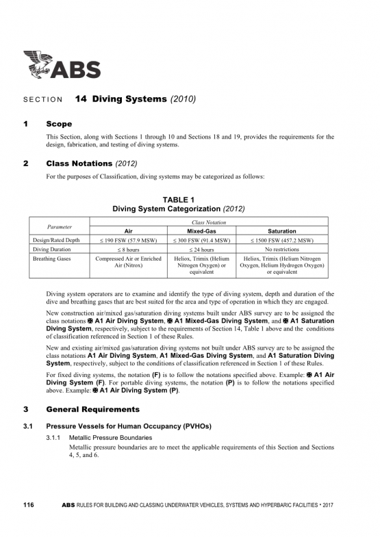 按照ABS规范建造且符合规范第1节分类条件的闸式潜水器,指定船级符号A1级闸式潜水器,新建与现存的未按照ABS规范建造的闸式潜水器,指定船级符号A1级闸式潜水器。