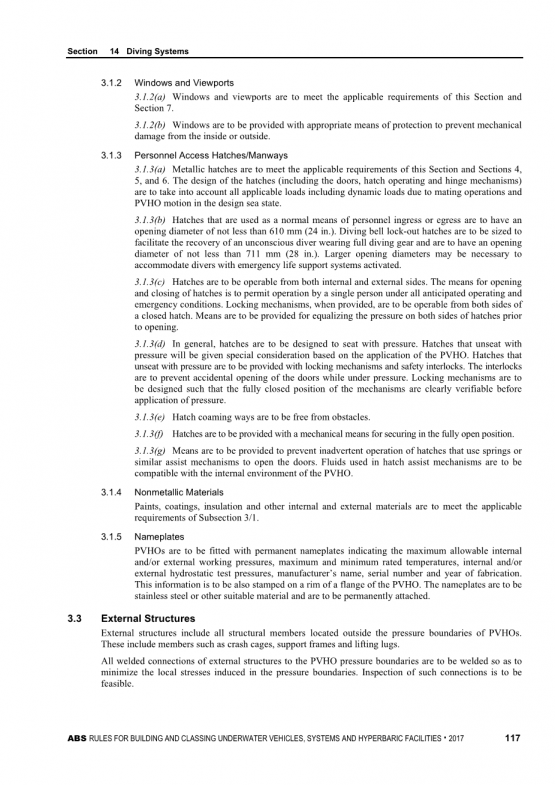 舱口(包括舱门,舱口操作和铰链机构)的设计应考虑所有适用的载荷,包括压力载荷和动态载荷(由于在设计海况下的潜水运动,对接工作等)。