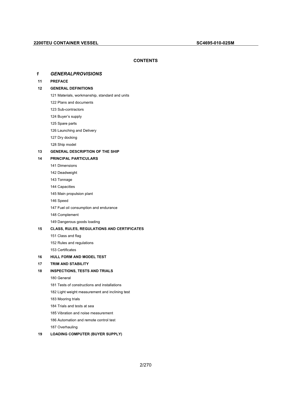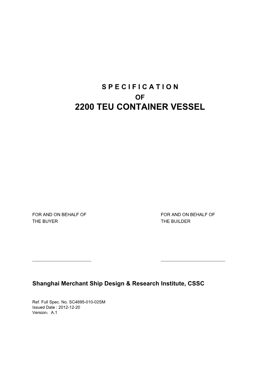 1总则第11条前言本规范的意图(以下简称规范)和随行计划描述和阐述了远洋船用单螺杆柴油驱动集装箱船的设计、材料、结构和设备。总布置图和制造者名单将伴随并形成规范的一个组成部分,以详细说明船只的详细设计。造船合同的条款,在船舶建造合同与规范之间存在异议、矛盾或任何不一致时,支配和支配。本规范及总布置图及其他附带的图纸、计划和图表描述了船的特点和能力,并应与图纸和文件附件–列表,表格的设计、基础施工、舾装和交付的船舶(S)。任何额外的要求,或改变的关于规范进一步细化建设者需要额外的详细图纸,或图纸等用于建造本船(S)按照造船合同和本规范应是建筑师的责任和建筑商的帐户,并应覆盖的合同价格。在规范的不同部分之间发生冲突或不一致的情况下,船体部分应以船体项目为准,机械部分与机械项目有关。在本规范,GA计划和其他图纸和文件之间的冲突或不一致的情况下,规格和GA计划为准。GA计划应作为指导性文件。应适当考虑到GA计划是在早期阶段的准备和精确的位置、尺寸、形状和结构元素的特点,设备和装备将受到调整时的详细图纸和文件准备,详细计算体积,重量和重力的区域,确定中心时建设者提供了详细的信息,所有设备和舾装件。要知道在本规范中没有提到的细节,但这是正常的和必要的,与国际一流的造船实践一致的完整的容器或为了满足规则,法规和船级社和主管部门的要求,应在设计建造中,该船的建造,交货。这些项目应由建筑商提供或安装在建造商的帐户上,当建造商遇到时,应向设计人员提出意见并由买方确认和批准。任何修改本规范和规则和/或规定或任何修改船级社或机关生效后签署的建设合同提供的合同价格调整的理由,约定的交货时间及任何其他适用的项目可能会受到影响。所有的图纸都要交付的船舶或买方办公室应按照最终的变化和在建造和舾装的船舶采用数字格式提供修改更新(Auto CAD DWG格式和PDF格式)和纸质“竣工”2200teu集装箱船sc4695-010-02sm 13 / 270图纸。在船舶交付给买方时未最终改正并更新的任何图纸,应尽快确定,并以快递方式交给买方。事实上,图纸和/或其他文件,测试结果等已被买方批准,不以任何方式减轻建设者的责任,根据船舶建造合同和本规范。除本规范所附或提及的GA计划、图纸、图表等外,仅作指导。最终图纸和计算应在施工开始前由船级社、买方和有关当局批准。规格的任何更改或改动应作为变更顺序(VO)处理,并应在施工人员、设计人员和买方签订任何工作之前,以书面形式正式签署并签署。VOS应当签订时,被视为一个正式编的建筑合同和本建筑规范。变更命令的标准形式应在工作开始时由各方同意。约定的形式将用于所有沃斯提出在项目。额外费用和信用费用清单应由建造方保管,并须在买方同意的定期间隔内不超过一个月(1)个月。有关VOs的工作,任何额外的成本或费用应根据建筑师或设计师的正常率是适当的计算,除非另有工作才能开始减少可能的额外的设计费用的书面同意,任何建议改变或附加影响和工程图纸的设计应在相关部分或区的设计工作将开始,不少于4周之前,这样的设计工作是因为要完成提交及时向设计师。在适当的情况下,约定的交货时间应延长所需的时间准备和执行额外的工作或变更所述的VO。在规范中使用“或”、“或”、“如有必要”和其他类似的表达方式,其应用应在建造方与买方之间相互商定。在第一部分总则中的描述将被应用于该规范的所有部分,如在其他部分中的描述被应用于各自的部分,如果没有描述的话。建造方提供按照本规范规定完成的船只所需的所有物品,除本合同规定的条款外,由买方提供和提供的物品除外。规格中提到的两次以上的,应只提供一次或执行。买方的任何要求,这是对规则和上市规定和/或本规范的内容规定的要求过多,受协议和合同价格、自重、服务速度调整、交付时间等,这可能会影响。这些修改和变更的规范、图纸或其他书面文件的2200teu集装箱船sc4695-010-02sm 14 / 270授权代表的建设者和买方签署。这些文件是合同的补充和最新文件的管理。批准的计划中,双方同意设计不同的规格,据了解,关于这些改变的规范条款将不再适用,因此,在这些情况下批准的图纸应以规范的补充。如果任何指定的物品或材料不能获得或提供,建造商有权选择适当的替代品与Buyer的批准。所有文件,图纸,标记和指示,指示和通信应在英语。2200teu集装箱船sc4695-010-02sm 15 / 270 12一般定义121材料、工艺、标准和单位1211材料、机械设备等应按照说明书和厂商表。用于船级社建造的船舶和机械的所有结构钢,包括锻件和铸件,以及造船和轮机工程的质量,经检验、检验和认证。工艺应符合国际标准,并符合国际惯例。所有木材应经过良好的处理,无缺陷。石棉,制冷剂(R 12、R 22),哈龙,含铅油漆和锡基防污涂料不用。