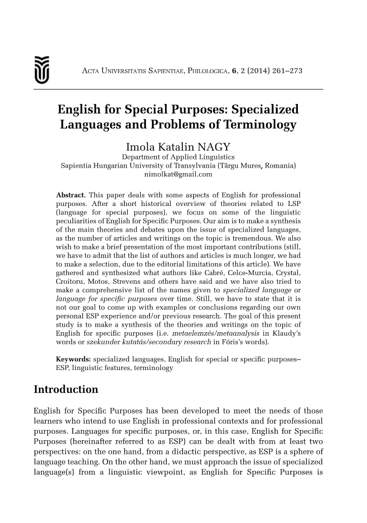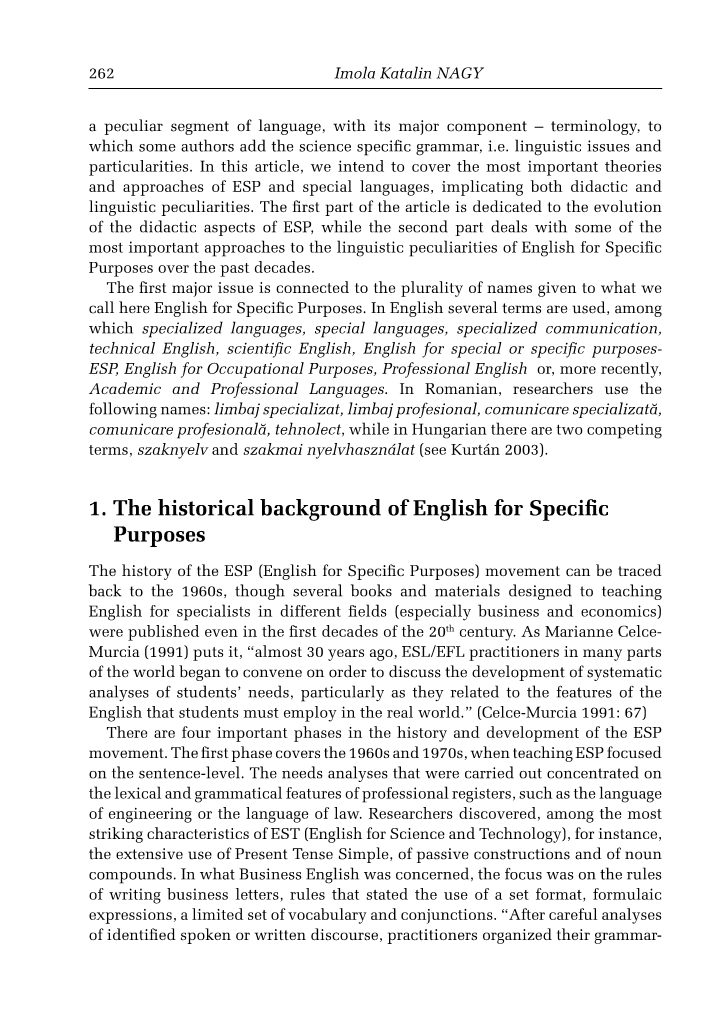 第一个主要问题与我们在这里称之为专门用途英语的多个名字有关。英语中使用了几个术语,其中包括专门语言,特殊语言,专门交流,技术英语,科学英语,用于特殊目的的英语-ESP,用于职业目的的英语,专业英语,或者最近使用的学术和专业语言。在罗马尼亚语中,研究人员使用以下名称:limbaj Specialize,limbaj Professional,comunicare Specialize,comunicare Professional,tehnolect,而在匈牙利有两个竞争术语,szaknyelv和szakmai nyelvhasznaacute;lat(见Kurtaacute;n 2003)。