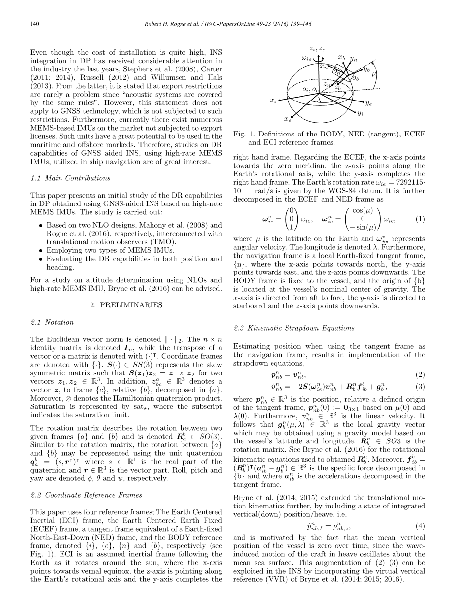 INS可以通过许多传感器和位置参考(PosRef)系统来辅助,例如无线电,激光,水声和基于卫星的系统。后者具有受益于全球范围的优势,被称为全球导航卫星系统(GNSS)。但是,这写系统会遭受自然退化和故意中断的影响。自然退化可能是由于附近物体反射引起的信号失真(称为多径),太阳风暴造成的信号损失或卫星的视线的损失引起的。故意中断的原因可能是信号干扰。在失去参考的过程中,良好的灾难恢复能离对于INS向目标设备提供准确的PVA估算对于用户至关重要。使用非线性观测器(NLO)的辅助INS的最新工作,例如Hua(2010),Grip等。(2013),bryne等人。(2014;2015),Grip等人(2015),以及Ronge等(2016),尚未讨论使用此类观察者设计的灾难恢复功能。Fusini等人是一个例外。(2016 ),但是这个结果使用视觉辅助的继承导航系统来改善航迹推算兵提供速度辅助,这又被用来改善DR的能力。对海洋水面船舶,特别是在动态定位(DP)中,由于船级社要求提供了多个航向参考,例如DNV GL(2011),而是使用INU和NLO的DR功能在船舶导航中得不到应有的帮助。