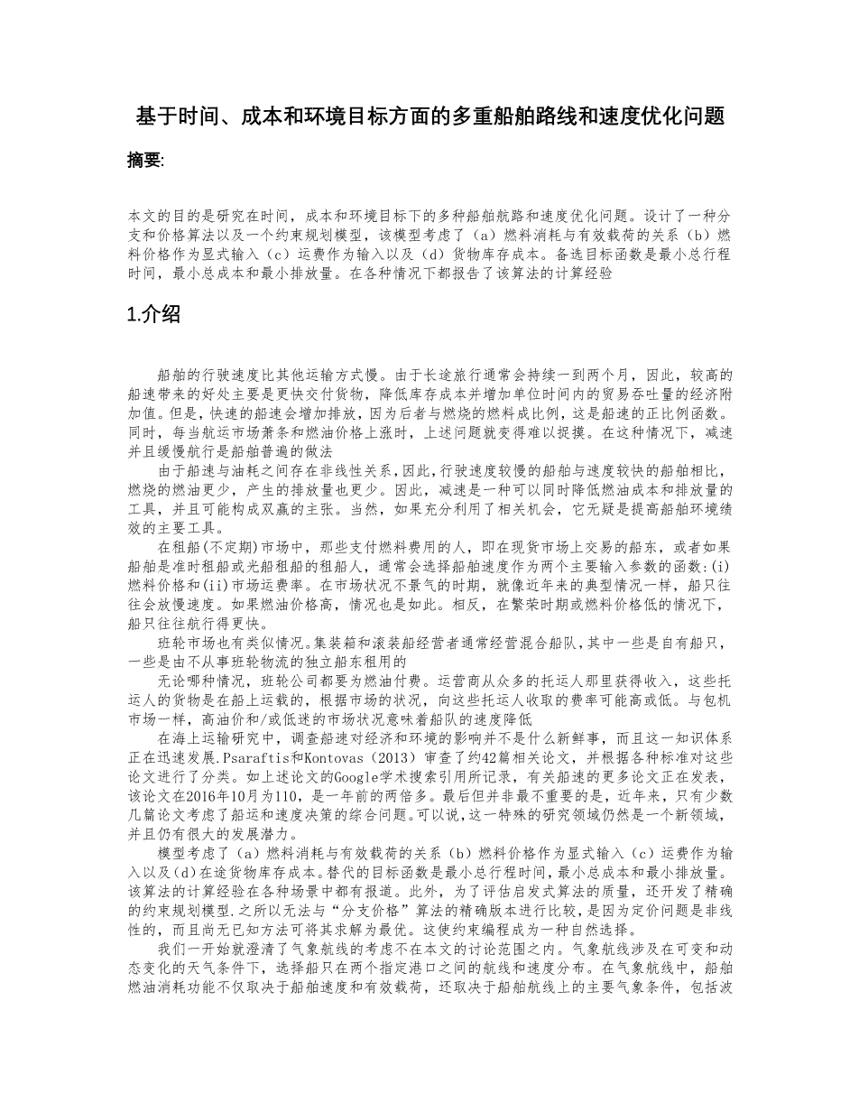 基于时间、成本和环境目标方面的多重船舶线路和速度优化问题外文翻译资料 2022-08-01 21:55:51 英语原文共 19 页,剩余内容已隐藏,支付完成后下载完整资料 英语译文共 18 页,剩余内容已隐藏,支付完成后下载完整资料 资料编号:[241399],资料为PDF文档或Word文档,PDF文档可免费转换为Word 原文和译文剩余内容已隐藏,您需要先支付 30元 才能查看原文和译文全部内容!立即支付 发小红书推广免费获取该资料资格。点击链接进入获取推广文案即可: Ai一键组稿 | 降AI率 | 降重复率 | 论文一键排版 PREVIOUS NEXT 您可能感兴趣的文章 进水流道与船体的整体优化以及当前现状 为改进运行效率提出的一种先进的喷水推进器进水流道设计以及 与船体整合后的最优化方案外文翻译资料 对于超级游艇的先进的推进装置(系列)外文翻译资料 防止意外船舶碰撞的海洋结构物设计外文翻译资料 焊接接头处结构应力的定义和疲劳分析的数值方法外文翻译资料 一类双曲型守恒律的激波捕捉格式外文翻译资料 拍动翼力学特性分析外文翻译资料 对海上三体船操作和维护的特征参数和阻力图谱的研究外文翻译资料 “005”自升式钻井平台方案设计外文翻译资料 由单色和不规则波组成的升降平台的土壤 结构相互作用分析外文翻译资料 适应深水作业加长自升式桩腿长度的研究外文翻译资料