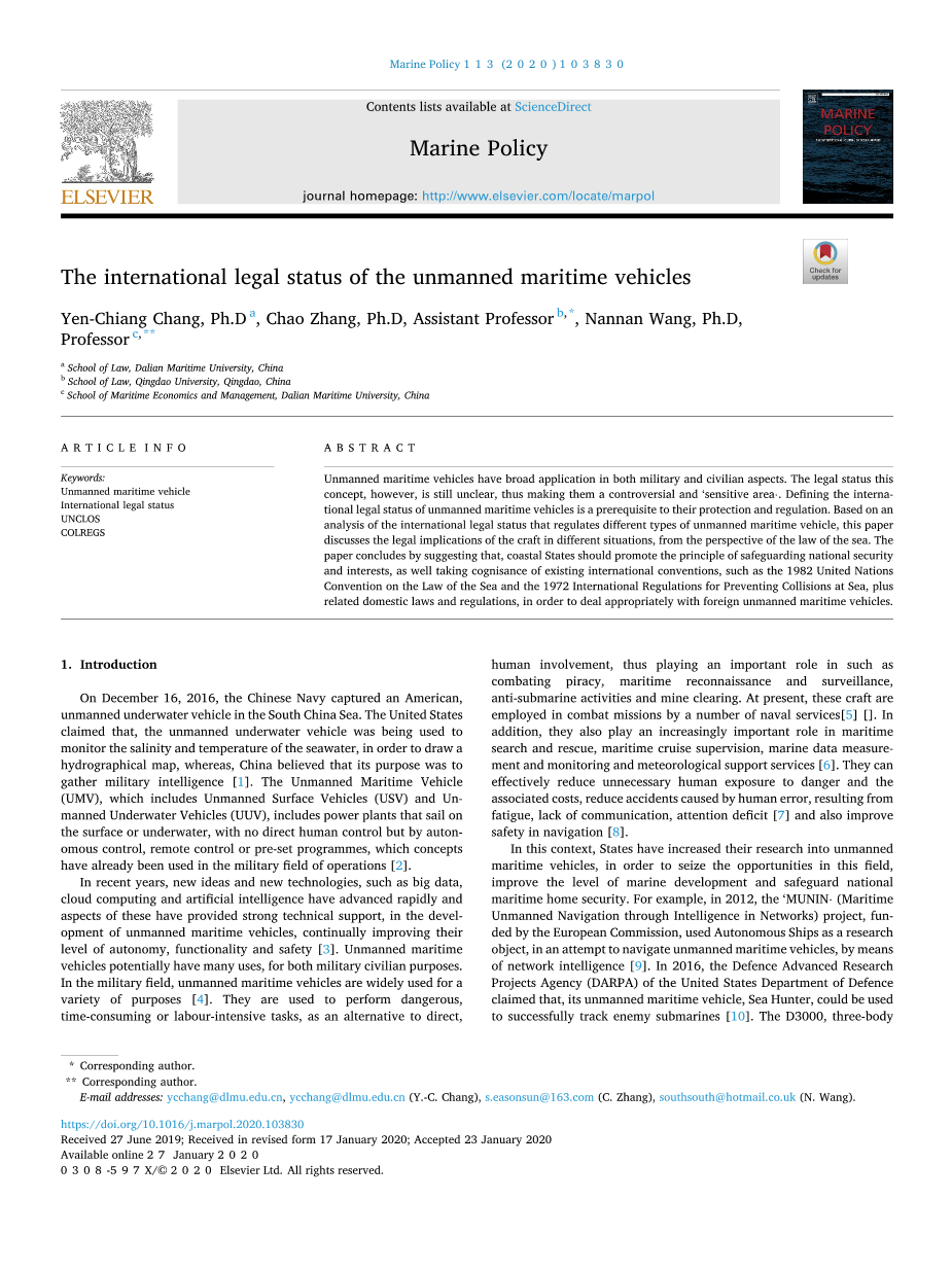 关键词:无人驾驶船舶国际法律地位;联合国海洋法公约;