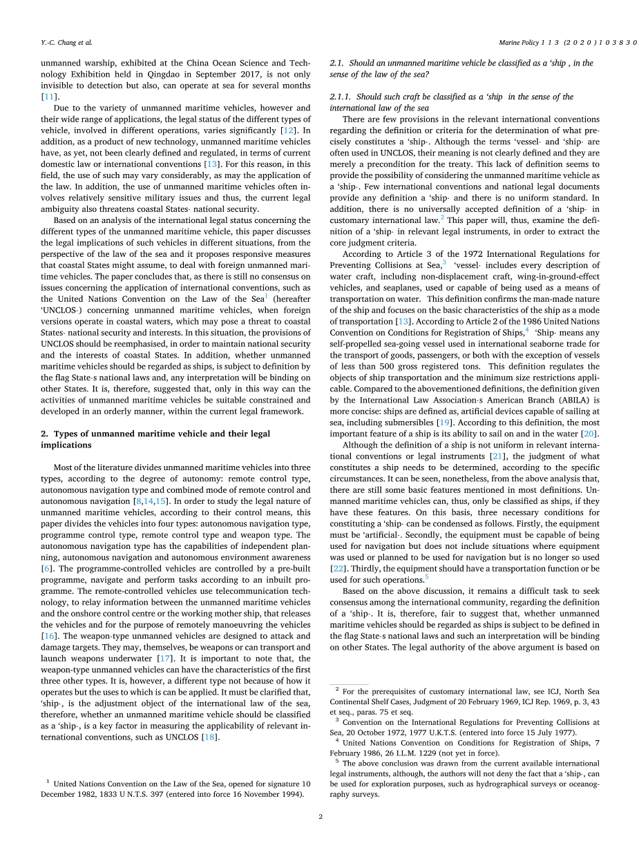 在相关的国际公约中,很少有关于定义或标准的规定,来确定什么才算是“船舶”。虽然“船只”和“船舶”这两个术语在UNCLOS经常使用,但它们的含义没有明确界定,它们只是条约的一个先决条件。这种定义的缺乏似乎提供了将无人驾驶海上交通工具视为“船只”的可能性。很少有国际公约和国家法律文件对“船舶”做出任何定义,也没有统一的标准。此外,习惯国际法中没有普遍接受的“船舶”定义。因此,本文将审查相关法律文书中“船舶”的定义,以提取核心判断标准。根据1972年《国际海上避碰规则》第3条,“lsquo;船舶rsquo;包括各种水上交通工具,包括非在航航行器、地效翼船和水上飞机,用作或能够用作水上交通工具。”这一定义确认了船舶的人造性质,并侧重于船舶作为一种运输方式的基本特征。根据1986年《联合国船舶登记条件公约》第2条,“lsquo;船舶rsquo;是指在国际海运贸易中用于运输货物、乘客或两者的任何自航海船,但总注册吨位低于500吨的船舶除外。”该定义规定了船舶运输的目的和适用的最小尺寸限制。与上述定义相比,国际法协会美国分会给出的定义更加简洁:船舶被定义为能够在海上航行的人工装置,包括潜水器。根据这个定义,一艘船最重要的特征是它在水上航行的能力。