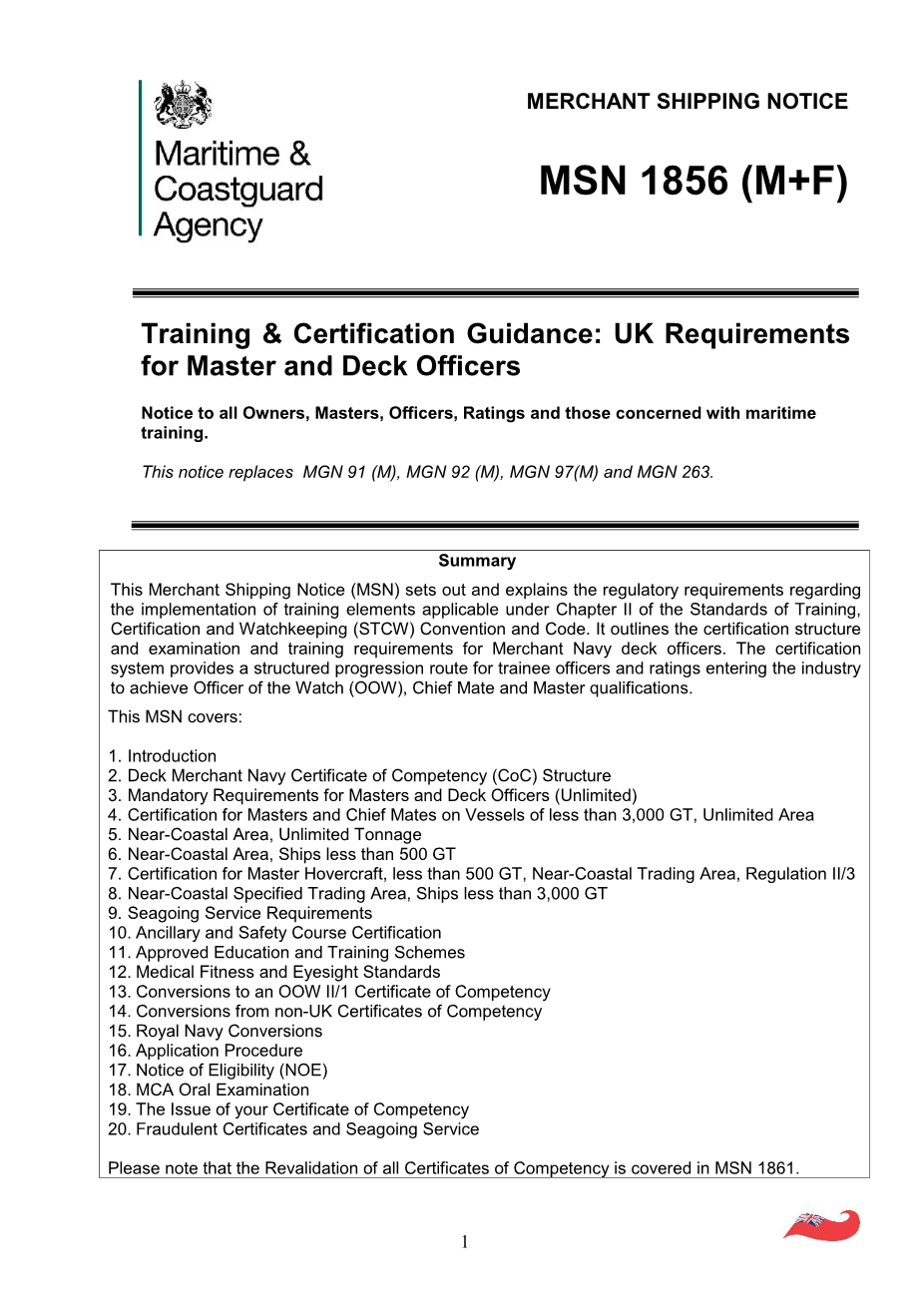 培训和认证指南:英国要求船长和甲板人员 通知所有船东、船长、高级船员、普通船员及与海事有关的人训练。本通知取代MGN91(M)、MGN(M)、MGN97(M)和MGN263
