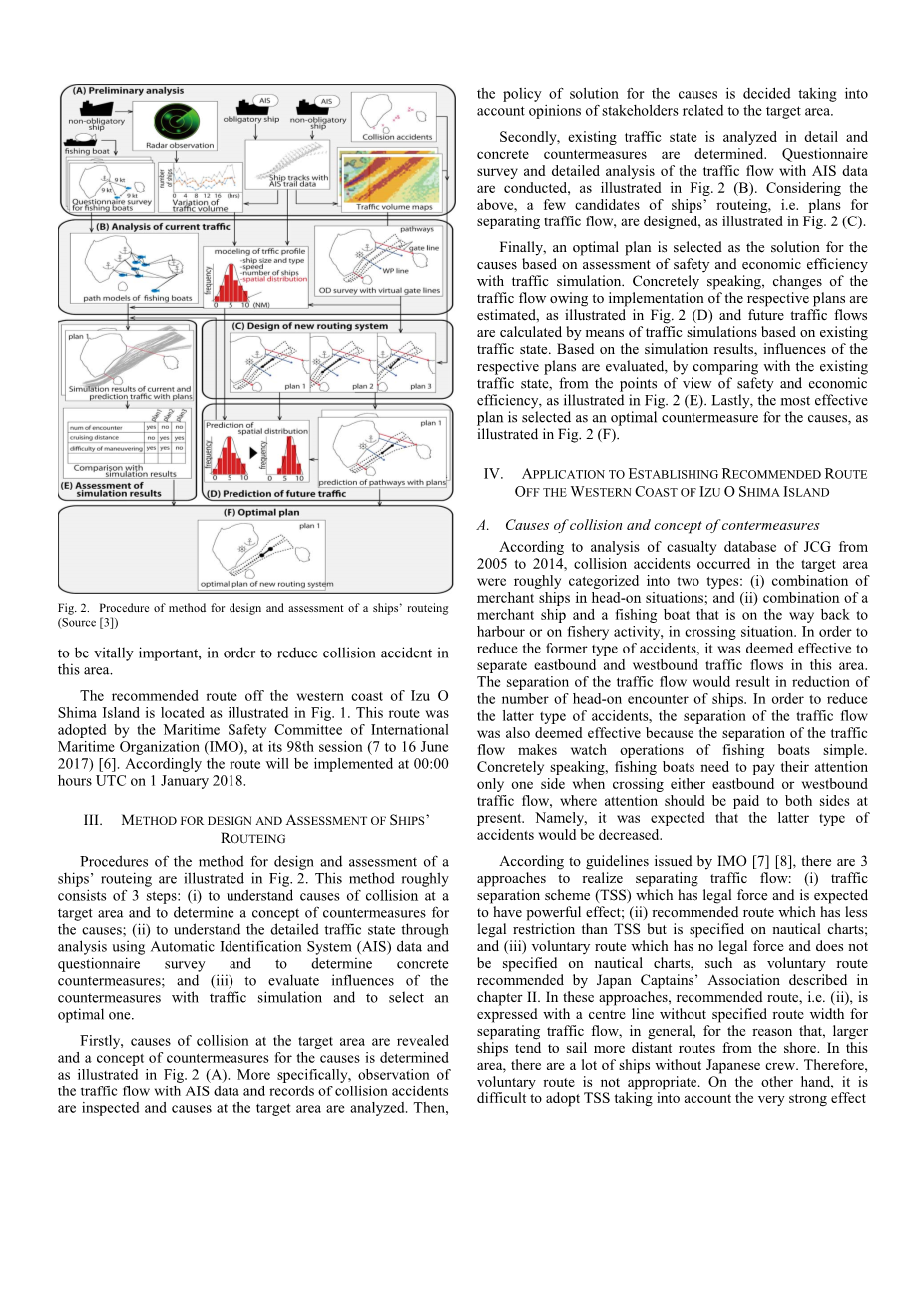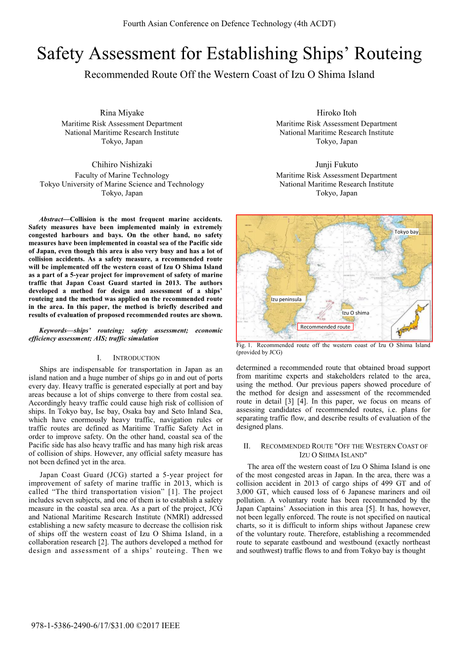 Abstract—Collision is the most frequent marine accidents. Safety measures have been implemented mainly in extremely congested harbours and bays. On the other hand, no safety measures have been implemented in coastal sea of the Pacific side of Japan, even though this area is also very busy and has a lot of collision accidents. As a safety measure, a recommended route will be implemented off the western coast of Izu O Shima Island as a part of a 5-year project for improvement of safety of marine traffic that Japan Coast Guard started in 2013. The authors developed a method for design and assessment of a shipsrsquo; routeing and the method was applied on the recommended route in the area. In this paper, the method is briefly described and results of evaluation of proposed recommended routes are shown.