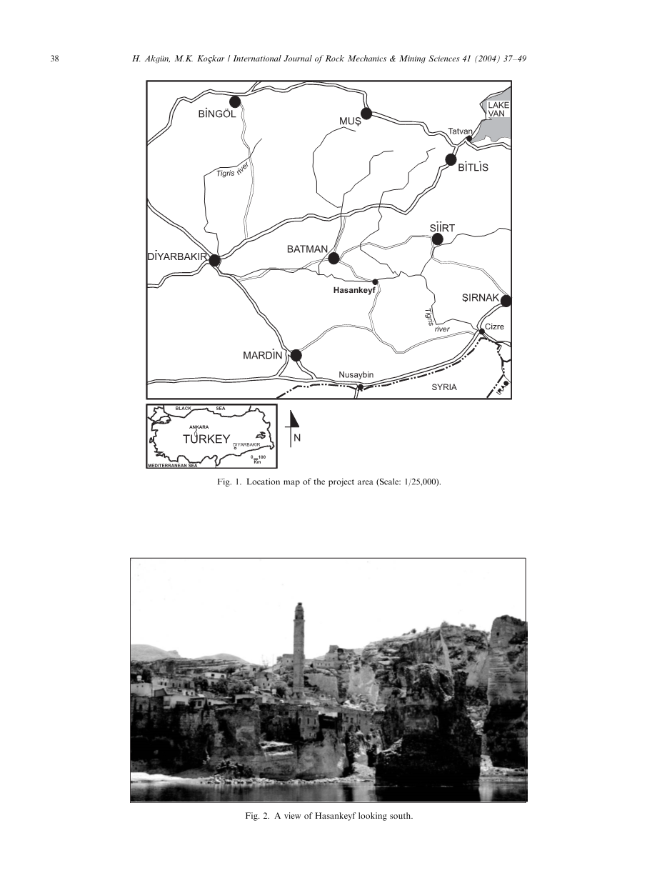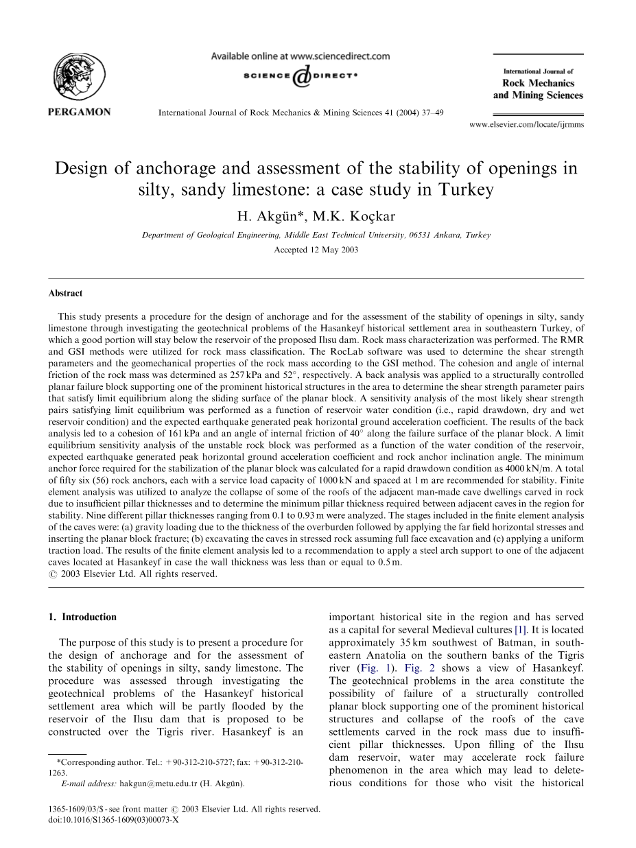 - 本研究的目的是提出一种锚固设计和开孔稳定性评估的程序,在粉砂质石灰岩。过程是通过调查评估针对Hasankeyf历史解决地区的岩土工程问题,将部分淹没Ilısu大坝的水库建设提出了底格里斯河。针对Hasankeyf是一个该地区重要的历史遗址,曾是几个中世纪文化的首都。它位于蝙蝠侠西南约35公里处,位于安纳托利亚东南部的底格里斯河南岸(图1)。该地区的岩土问题构成了结构控制的平面块体支持一个突出的历史结构的可能性,以及由于柱子厚度不足而在岩体中雕刻的洞穴聚落的屋顶倒塌的可能性。经Ilısu填充坝水库,水可能会加速该地区岩石破裂现象可能导致有害的条件对于那些访问历史仍高于水库最高水位的构造[2,3]。根据RMR和GSI方法,该地区的岩土工程研究包括岩体特征和岩体分类。根据GSI方法,利用RocLab软件确定岩体的抗剪强度参数和地质力学性质。由于采用岩体岩土参数来评价溶洞沉降的稳定性,因此采用了RocLab的隧道应用方案。摘要对该地区一处重要历史建筑的结构控制的平面破坏块体进行了反分析,确定了满足滑动面极限平衡状态的抗剪强度参数对。对满足极限平衡的最可能的抗剪强度对进行敏感性分析,并将其作为水库水条件(即预测地震所产生的峰值水平地面加速度系数。摘要对不稳定岩体进行了极限平衡灵敏度分析,分析结果表明,不稳定岩体的极限平衡灵敏度与水库水环境、地震预期峰值水平地面加速度系数和岩石锚索倾角有关。利用有限元分析方法,分析了因岩柱厚度不足而在岩石中雕刻的邻近人工窑洞的部分屋顶的倒塌,并确定了该地区相邻洞穴之间为稳定所需的最小岩柱厚度。分析了0.1 ~ 0.93m的9种不同煤柱厚度。提供了洞穴支持的建议。