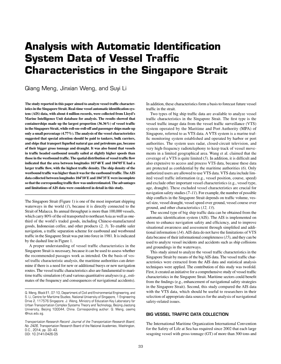 可以使用两种类型的大型船舶交通数据来分析新加坡海峡的船舶交通特征。第一种是来自新加坡海事和港口管理局(MPA)运营的船舶交通监视(VTS)系统的船舶交通图像数据,称为VTS数据。VTS系统是由港口或港口当局建立和运营的海上交通监控系统。该系统使用雷达,闭路电视和超高频无线电电话来跟踪有限地理区域内的船只移动。王等声称VTS的覆盖范围非常有限(5)。另外,访问和处理VTS数据既困难又昂贵,因为这些数据受到海事当局的保密保护(6),仅允许授权用户使用VTS数据。VTS数据包括有限的船舶通行信息(例如,船舶位置,航向,速度),并且不包括其他重要的船舶特征(例如,船舶类型,年龄,吃水深度)。这些排除的船只特性对于航行安全研究至关重要(7-11)。例如,在新加坡海峡可能发生的船舶冲突数量取决于交通量,船只尺寸,船只吃水,船只在地面上的速度,船只在地面上的航向以及其他特征(12、13)。