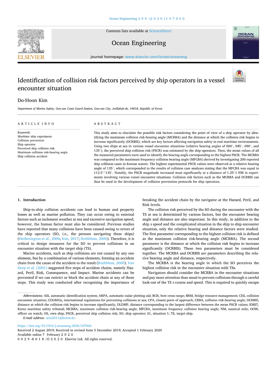 船舶域是一个众所周知的概念,古德温(1975)将其定义为“船舶领航员希望避开其他船舶或固定物体的周围有效水。”。(2018)在船舶领域的研究中,基于船舶操纵性数据进行模拟实验,以确定让路情况下避碰操纵所需的距离。然而,在使用模拟器进行的船舶碰撞研究中,由于模拟的场景是虚拟的,参与者比真实场景体验到的心理压力要小。为了克服这一局限性,本研究首先通过对两艘实船(韩国海岸警卫队大型船舶)进行遭遇情况实验,测量与人为失误相关的船舶碰撞风险,确定了MCRBA和DCRBIS。其次,对韩国海事安全法庭(KMST)的船舶碰撞案例进行了分析,确定了最大频率碰撞方位角(MFCBA)。通过比较,验证了MCRBA和DCRBIS的正确性。