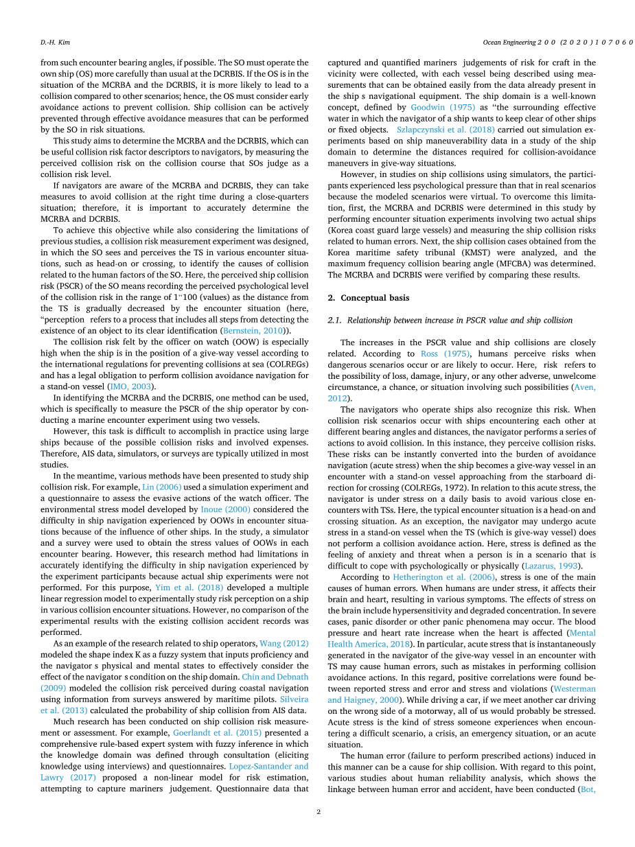 在识别MCRBA和DCRBIS时,可以使用一种方法,即通过使用两艘船舶进行海上遭遇试验来测量船舶操作员的PSCR。然而,在实际使用大型船舶时,由于可能存在的碰撞风险和涉及的费用,这一任务很难完成。因此,AIS数据、模拟器或调查通常用于大多数研究。与此同时,对船舶碰撞风险的研究也提出了多种方法。例如,Lin(2006)使用模拟实验和问卷来评估值班人员的避碰行为。Inoue(2000)建立的环境应力模型考虑了由于其他船舶的影响,OOW在遭遇情况下遇到的船舶航行困难。在本研究中,我们使用模拟机和问卷调查的方法,来获得每个接触轴承的应力值。然而,由于没有进行实际的船舶实验,这种研究方法在准确识别实验参与者在船舶航行中遇到的困难方面存在局限性。为此,Yim等人。(2018)开发了一个多元线性回归模型,以实验研究船舶在各种碰撞情况下的风险感知。但是,没有将实验结果与现有的碰撞事故记录进行比较。作为船舶操纵员相关研究的一个例子,Wang(2012)将模型指数K建模为一个模糊系统,输入熟练程度和导航员的身心状态,以有效地考虑导航员状况对船舶领域的影响。Chin和Debnath(2009)利用海上飞行员回答的调查信息,对沿海航行中感知到的碰撞风险进行了建模。Silveira等人。(2013)根据AIS数据计算船舶碰撞概率。