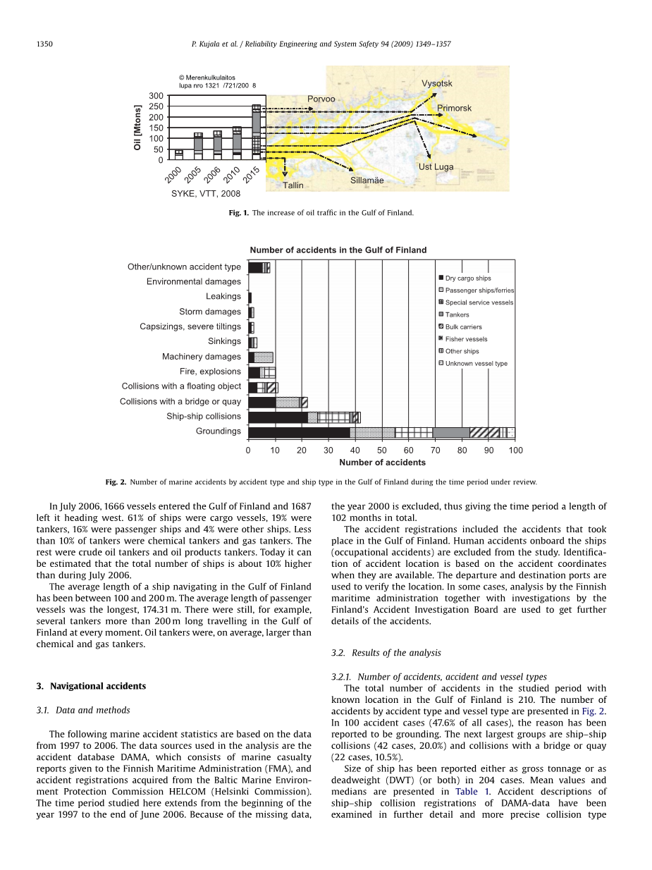 已经采取了一些措施来增加海上交通安全,如强制性船舶报告制度(GOFREP)和波罗的海天冬氨酸敏感海域(PSSA)的定义,都采取了这些行动地点在2004年。然而,日益增长的交通,特别是浅海油轮在年内事故风险很高这个区域。几份关于芬兰湾已经形成了[1-3],丹麦水域也形成了[4]但海运的总体风险仍然是估计。了解当前的风险对制定预防计划很重要采取措施并为可能的漏油做好充分准备其他事故。目前的风险水平也必须知道估计未来风险水平的变化交通。本文研究了GOF地区海上交通安全问题被分析。首先,过去10年的事故统计是描述了船舶碰撞的风险,并随后通过理论模型。最后是理论模型的结果与事故统计数据进行比较。