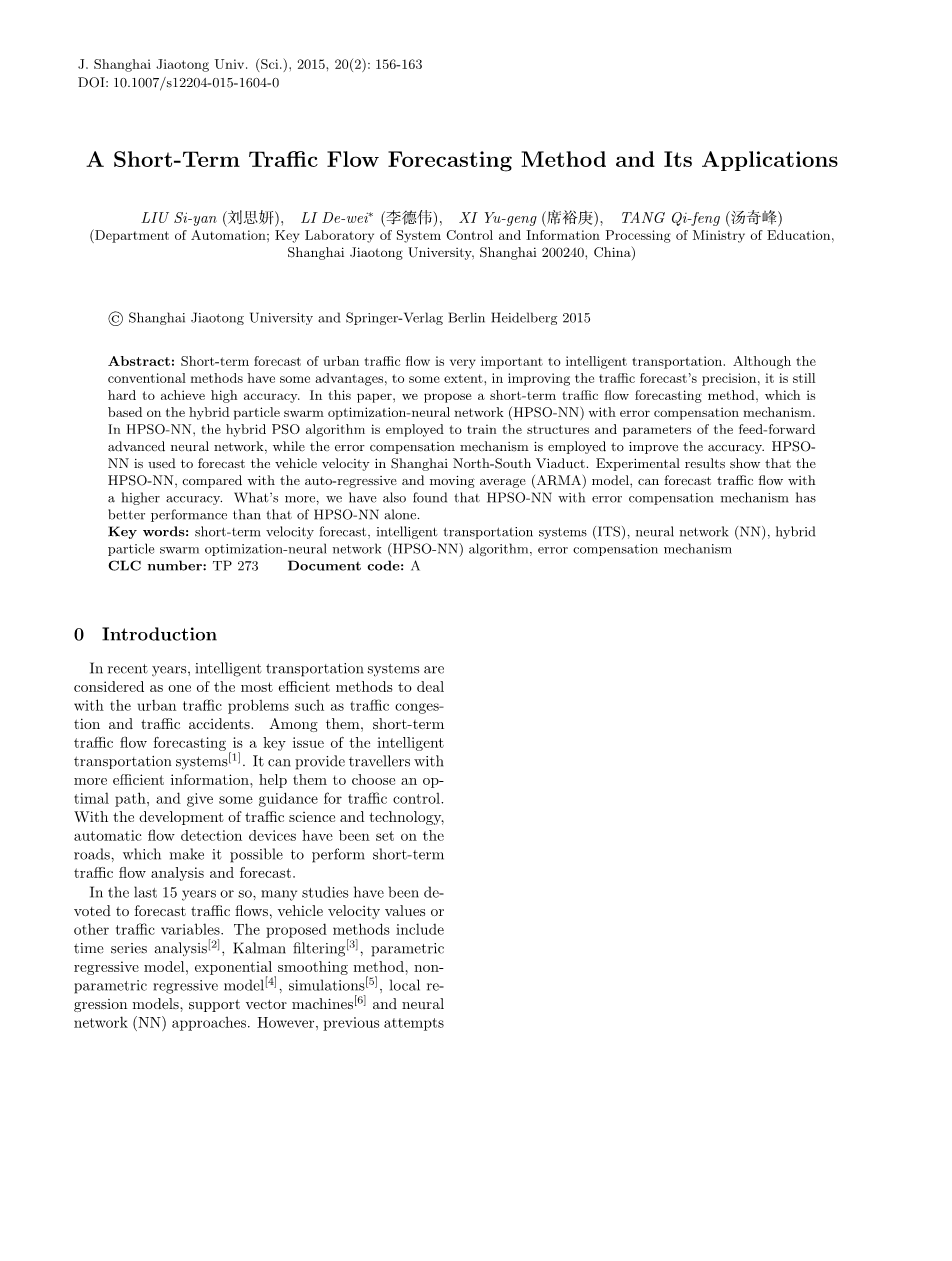 [1] Qiao De-hua, Zhang Kai-he, Fan Yao-zu. The optimizing of many traffiffiffic flflow forecasting models [J]. Communications Standardization, 2007, 164(4): 207- 210 (in Chinese).