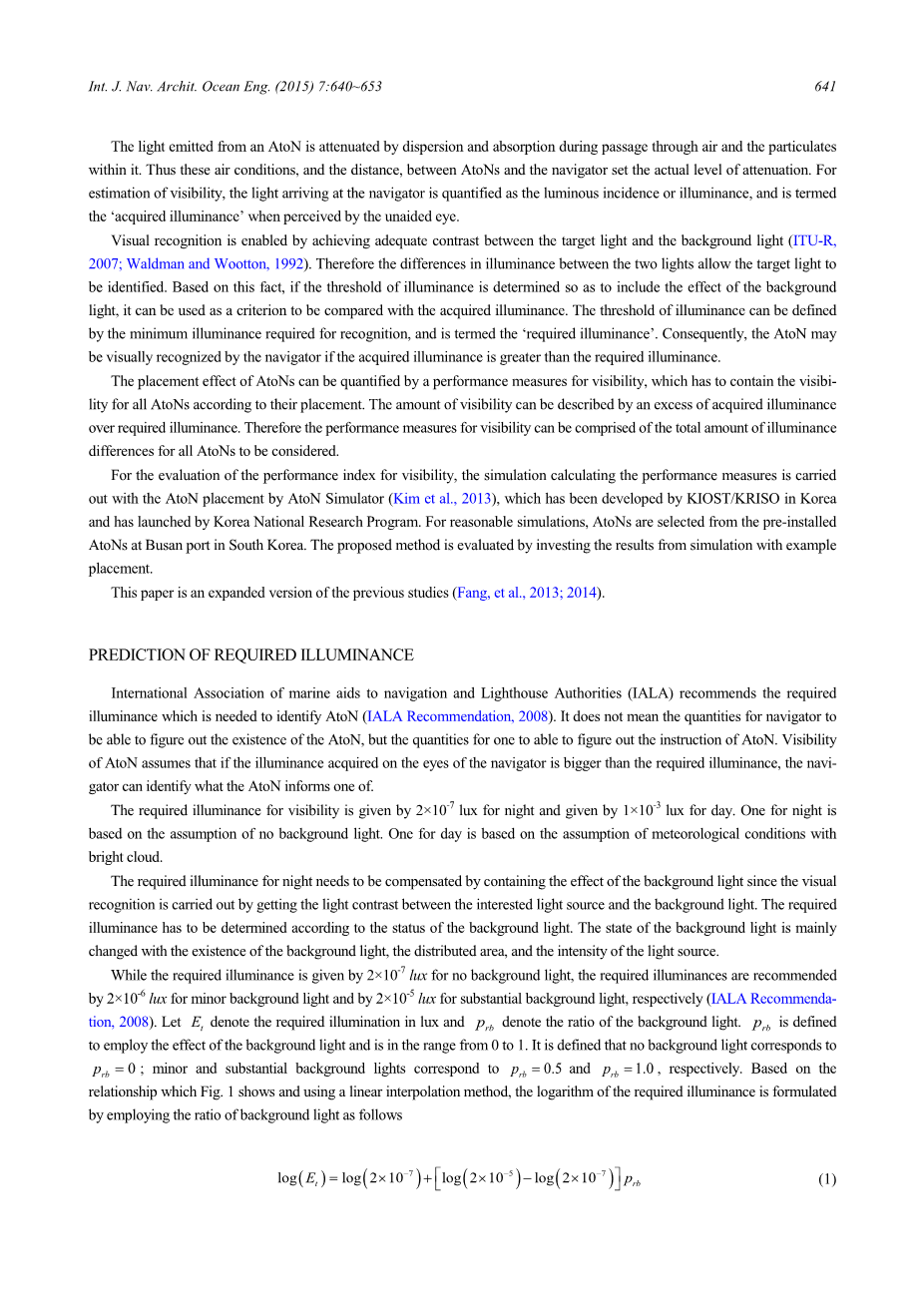 视觉识别是通过在目标光和背景光之间实现足够的对比度来实现的(ITU-R, 2007;Waldman和Wootton, 1992)。因此,两盏灯之间的照度差异使得目标光可以被识别出来。在这一事实的基础上,如果确定照度的阈值以包括背景光的影响,则可以将其作为与获得的照度进行比较的标准。照度的阈值可由识别所需的最低照度定义,称为“所需要的照度”。因此,如果获得的照度大于所需的照度,航行人员可以在视觉上识别出航标。