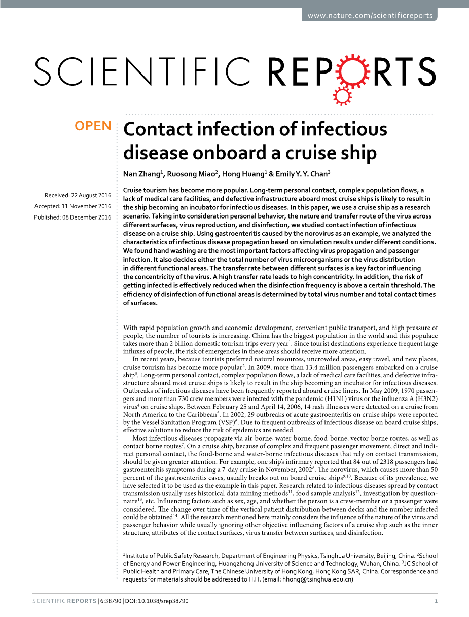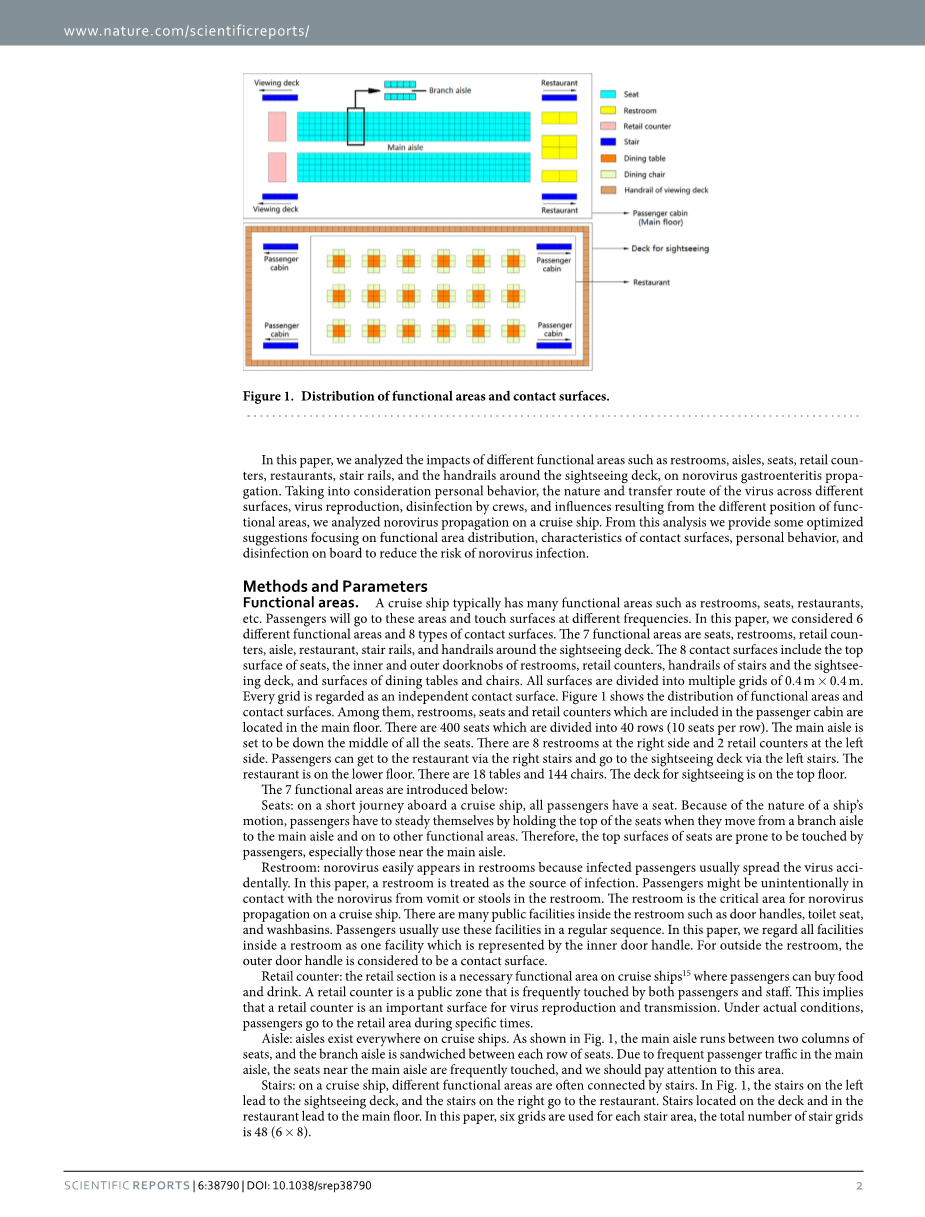 大多数传染性疾病通过空中传播,水传播,食物传播,媒介传播途径以及接触传播途径传播。在邮轮上,由于旅客移动频繁且频繁,直接和间接的个人接触,依赖接触传播的食源性和水传播传染病应得到更多关注。例如,一艘船的医务室报告说,在2002年的7天航行中,2318名乘客中有84名出现肠胃炎症状。引起超过50%的胃肠炎病例的诺沃夫病毒,通常在邮轮上爆发。由于它的普遍性,我们选择了它作为本文的示例。与通过接触传播的传染病有关的研究通常使用历史数据挖掘方法,食品样本分析,通过问卷调查等。考虑了诸如性别,年龄以及此人是机组人员还是乘客等影响因素。可以获得甲板之间垂直患者分布的时间变化和感染人数。这里提到的所有研究主要考虑病毒性质和乘客行为的影响,而通常忽略了邮轮的其他客观影响因素,例如内部结构,接触表面的属性,表面之间的病毒转移和消毒。