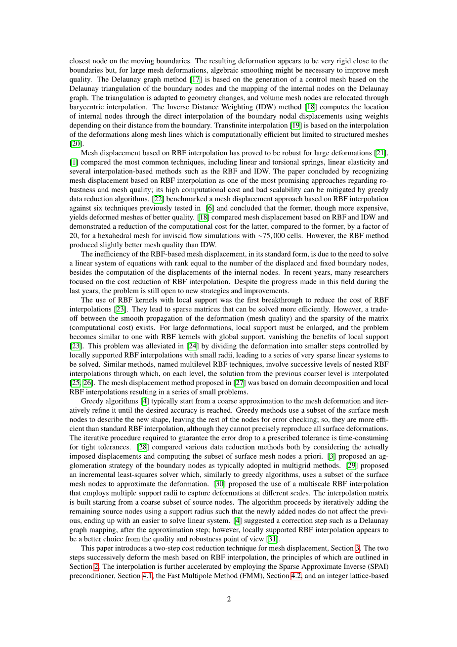 本文介绍了一种用于网格置换的两步成本降低技术,3. 这两个步骤基于RBF插值使网格连续变形,其原理在本节中概述。2. 通过使用稀疏近似逆(SPAI)预处理器,可进一步加快插值速度, 快速多极方法(FMM),和一个基于整数格的方法.