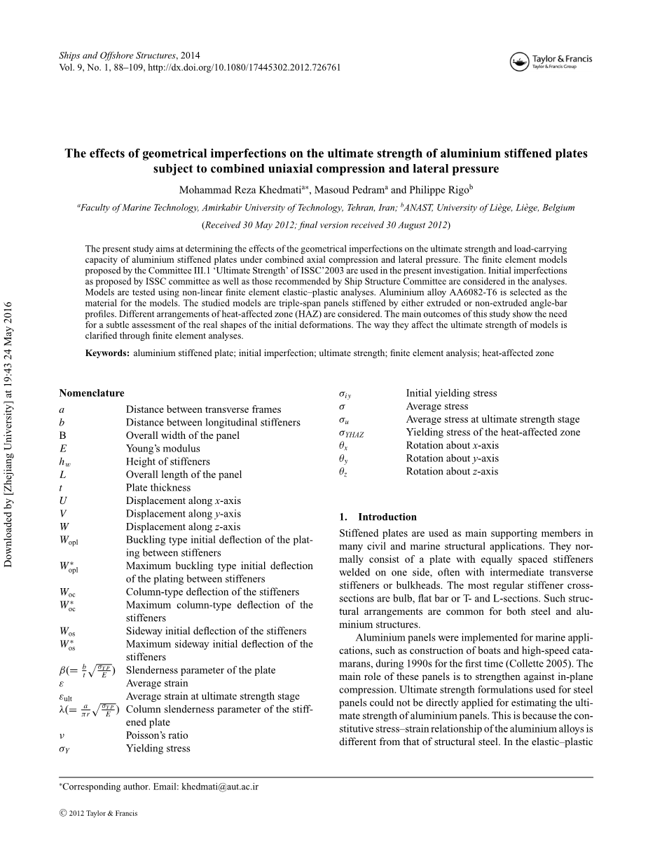 Sielski(2008)通过概述铝结构的未来趋势和研究需求,为研究人员建立了路线图。这些研究需要对以下领域进行研究:材料性能,结构设计,结构细节,焊接和制造,铝与钢的连接,残余应力和变形,疲劳设计和分析,防火,振动,维护和修理,减轻冲击载荷和新兴技术。通过有限元研究的进一步发展,进行弹塑性大挠度分析而加快了对不同结构的屈曲和极限强度领域的研究(Kim等,2009)。Khedmati等(2009)研究了镀层厚度,加强筋外形和尺寸变化对铝板极限强度和屈曲行为的影响。在研究中还考虑了由于焊接引起的最初缺陷。Khedmati和Ghavami(2009)考虑到固定/浮动加筋肋板研究中的缺点,建立了一系列有限元研究以发现加筋方法的优缺点。使用非线性有限元方法分析了Lattore面板和四个类似面板的尺寸。Khedmati等。(2010年),与ISSC 2003年第III.1委员会“超强度”所做的调查同时,选择了委员会的提出的模型并在轴向压缩和侧向压力下对其进行了分析。此外,本森等(2011年),使用非线性有限元方法,计算了一系列未加硬的铝板的强度,其材料和几何参数通常用于高速船的船体尺寸设计。基于一些参数研究,他们证明了几何和材料因素对板在崩溃点之前和之后的强度都有重要影响。从铝强度的研究中可以理解,已经采用了几种不同的方法来对焊接引起的初始缺陷进行建模,尤其是在有限元研究中。在大多数研究中,来自实验性研究的观察已得到实施。Paik的经验公式和Rigo提出的建模几何缺陷的程序是两种主要且最易于实施的方法。在本研究中,选择了ISSC2003提出的有限元模型。铝合金AA6082-T6是用于这些面板的材料。上述步骤在模型上执行,并使用非线性有限元分析在面内压缩和侧向压力的组合载荷条件下进行测试。最后,比较了两种缺陷模型的结果,并得出了正确的结论。