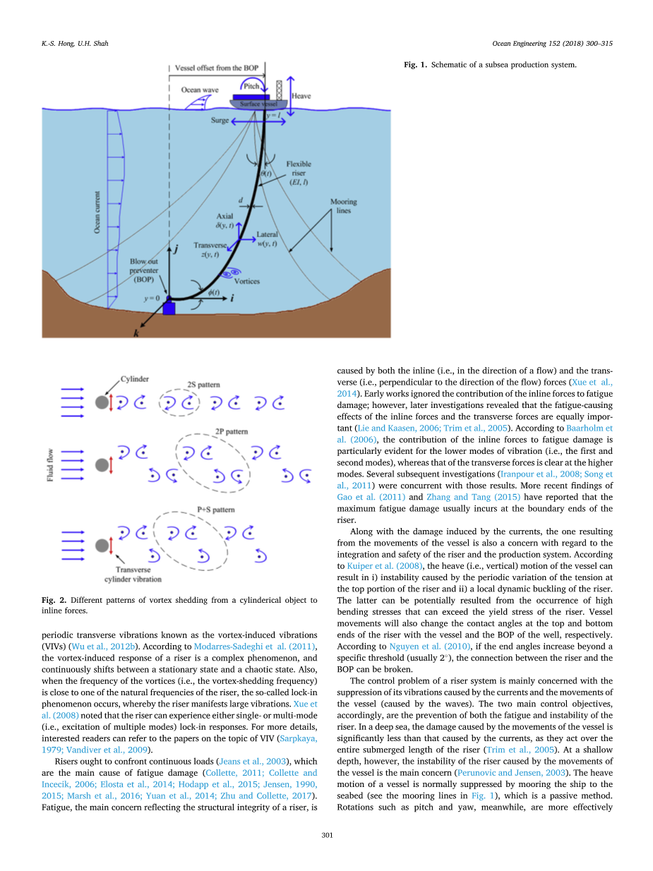 隔水管系统的控制问题主要是抑制由于水流和船舶运动(由波浪引起)而产生的振动。因此,两个主要的控制目标是防止隔水管的疲劳和不稳定性。在深海中,船舶运动造成的损害明显小于洋流造成的损害,因为洋流作用于整个潜水隔水管的淹没长度(垂幕等人,2005)。然而,在较浅的深度,由船舶运动引起的隔水管不稳定性是主要问题(佩鲁诺维奇和詹森,2003)。船舶的垂荡运动通常通过将船舶系泊在海床上来抑制(见图1中的系泊缆),这是一种被动方法。同时,利用推进器保持期望的船舶方向的主动控制策略更有效地抑制了俯仰和偏航等旋转(豪等人,2009)。关于疲劳预防,一个策略是设计具有较大安全系数的隔水管。莱拉等人(2005)进行可靠性分析,研究不同安全系数对控制大深度隔水管疲劳损伤的影响。关于VIV的抑制,被动装置,如扰流板(阿巴斯和摩洛斯,1996)和边条(高等人,2015a)可以安装在隔水管表面,以延长其疲劳寿命。抑制VIV的有效方法包括比例积分控制(拉斯塔德等人.,2008)、比例积分微分控制(詹森等人,2009b)、最优控制(马自利和桑切斯,2011)、边界控制(崔等人,2004;贺等人,2017;基姆等人,2005a,b;基姆和红,2009;阮和红,2010;杨等人,2004,2005a,b;张等人,2015;赵等人,2017),滑动模式控制(尼皋和红,2012a,b)和自适应控制(红,1997;红等人,2002;红和本茨曼,1994a,b)。